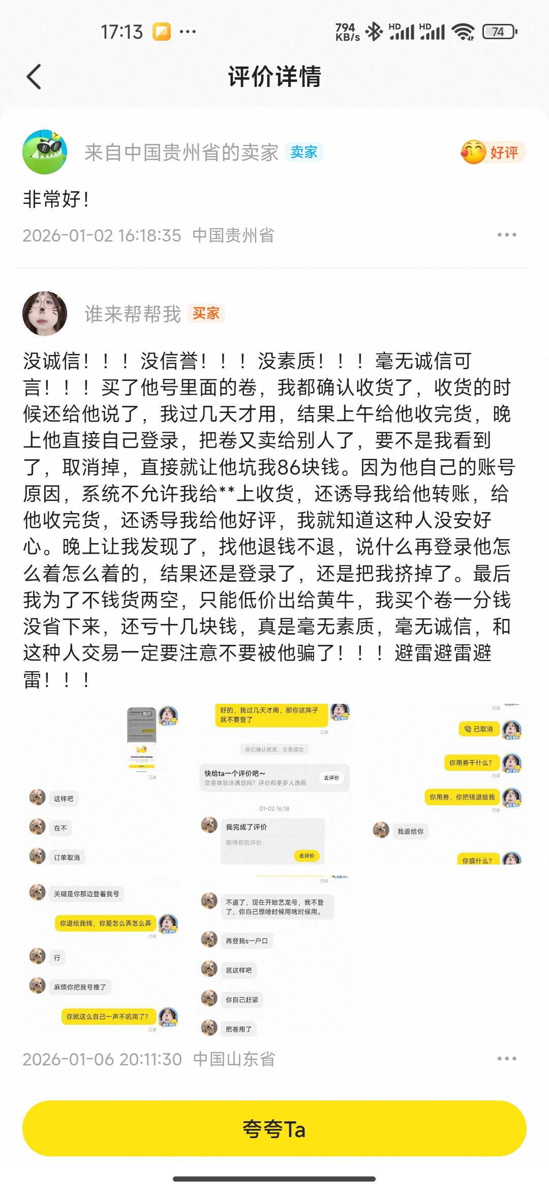 那个买家也是单纯,开始老哥想骗她转账,不行就诱导她提前收货。收货了登回来卖给别人,被她发现了把订单取消了,找老哥对峙,老哥一把鼻涕一把泪发毒誓不登了,结果转头又登号。买家赶紧低价出手,把老哥闲鱼投诉了,老哥气急败坏给买家差评,又跑到卡农颠倒黑白支使老哥们去冲买家。