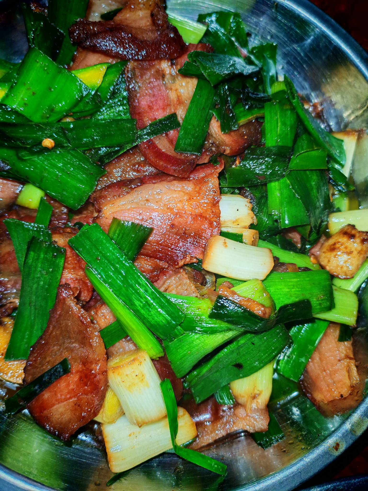 吃饭了老哥们,大盘鸡搞了一锅,四川腊肉炒蒜苗,香菇炒青菜,一瓶国台