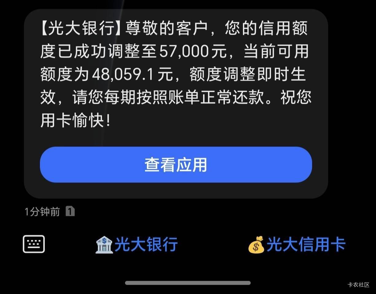 光大银行提升额度了,下卡6个月不到小涨2万7,去年7月份在光大银行取款,柜台推荐办白金卡,说必下还送200加油券,本来信用卡够多不想办,抱着给她冲业绩的想法办了张,下卡3万,还行,凑合着用,连续3月做了1万的账单,把年费拿回来了,说实话光大最短19天的免息期,有点那啥。今天上午的提升额度短信,下午才看到,进app试了下,提升额度成功。