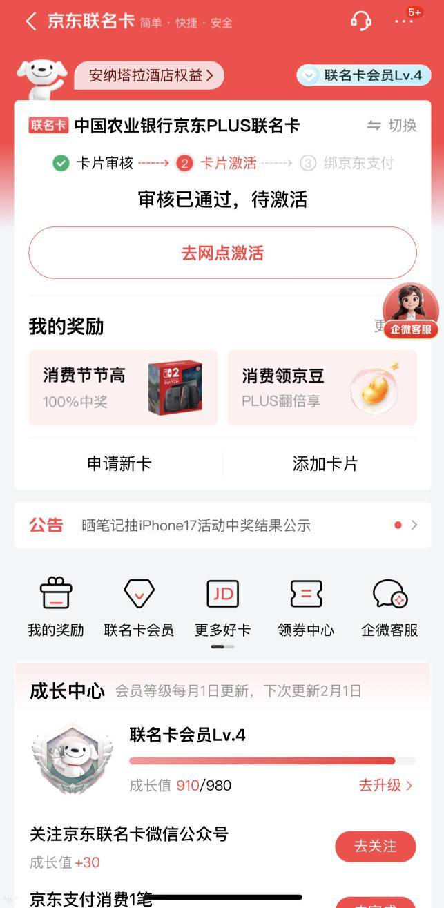 农行京东plus联名卡下卡,1.10京东app申请,1.13下午电审,然后通过,去年申请都是拒绝的,之前2025年12月试过美团联名卡也拒绝了,怀疑有点水