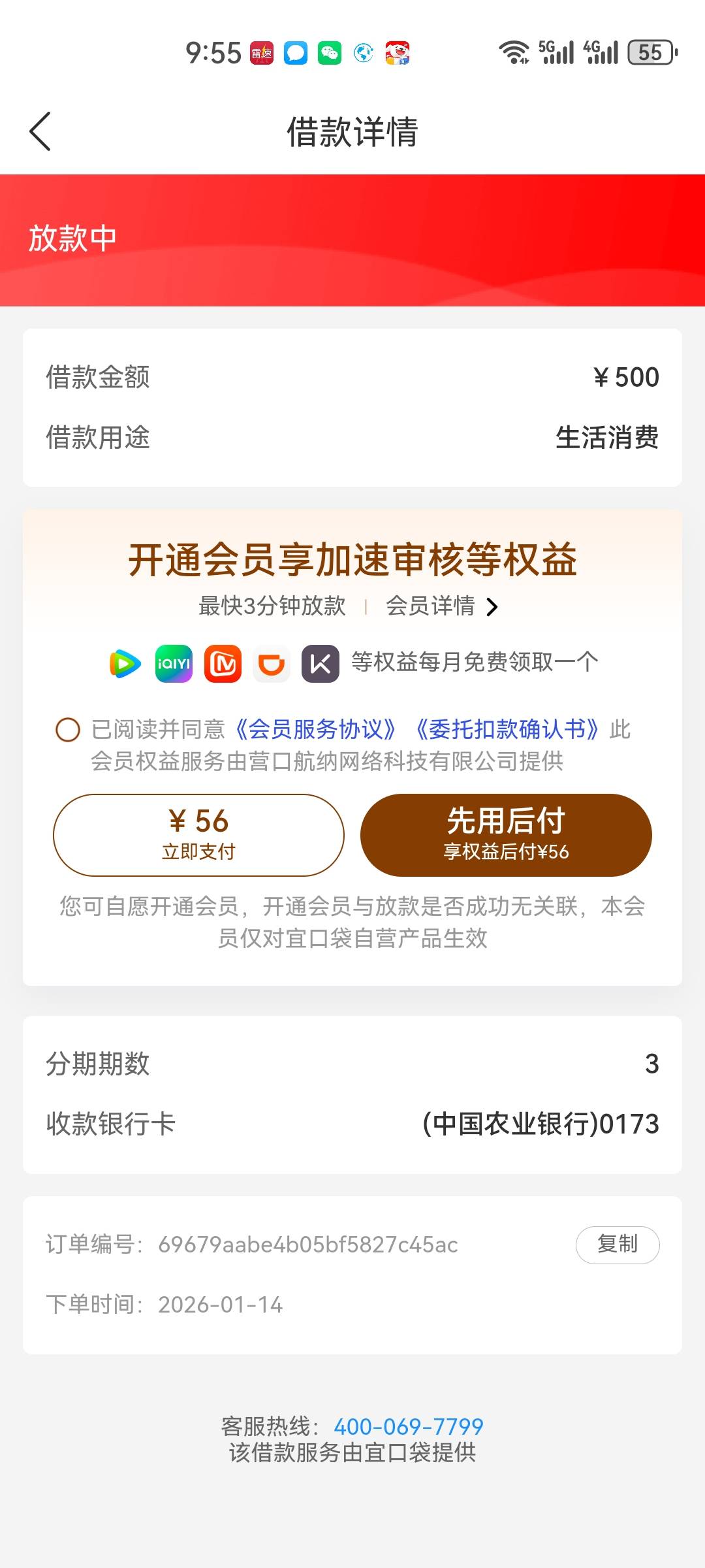 桔多里面的宜口袋,刚刚2000秒拒绝,然后出了500点了会员,没有秒扣款,哈哈哈哈,十几分钟到账,我京东金条逾期三年了,什么都没下,就今天这个下了