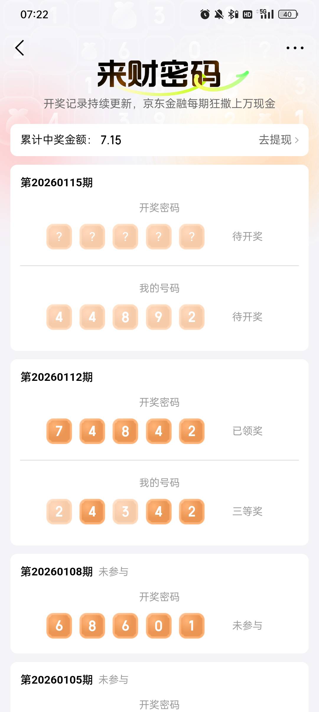 京东金融,来财密码参与过的看下中奖没,我的中了7块