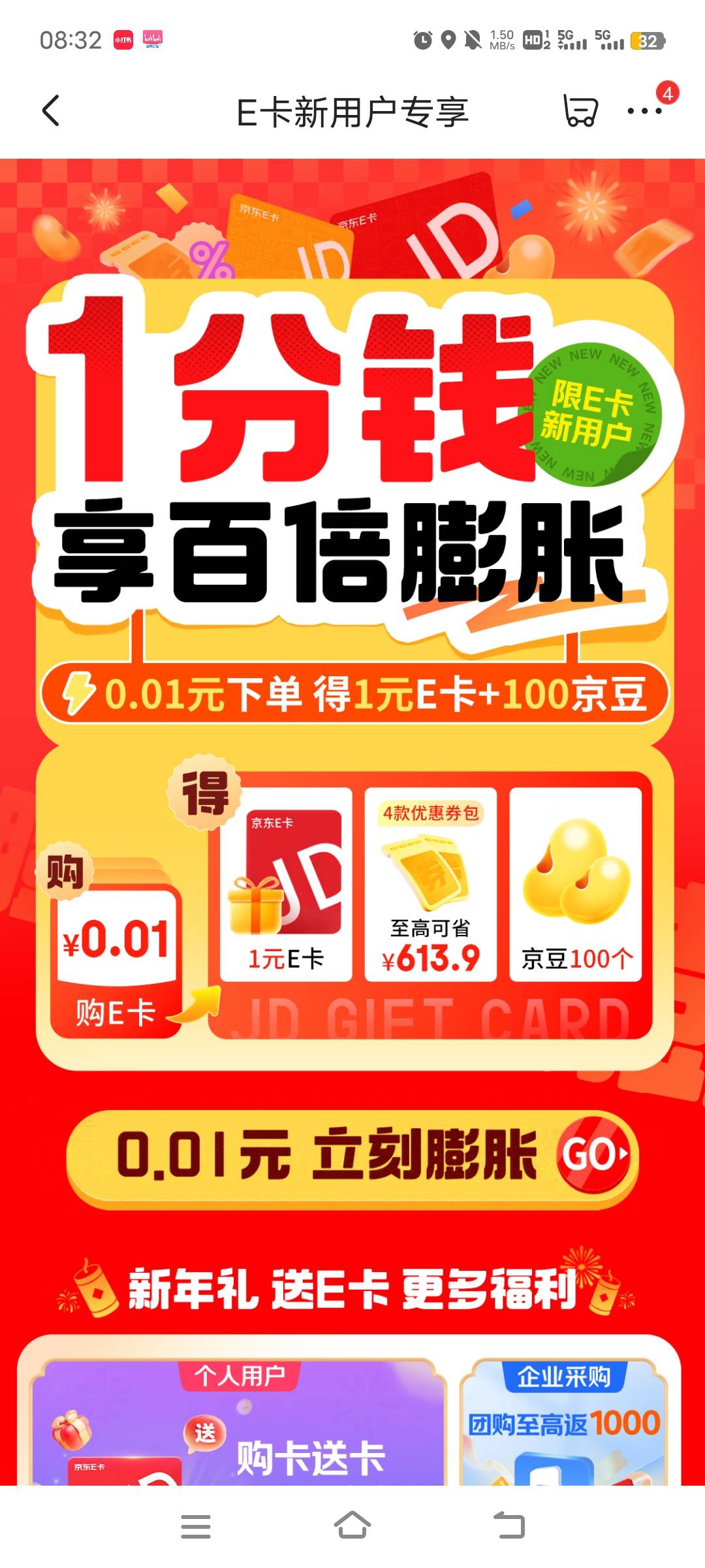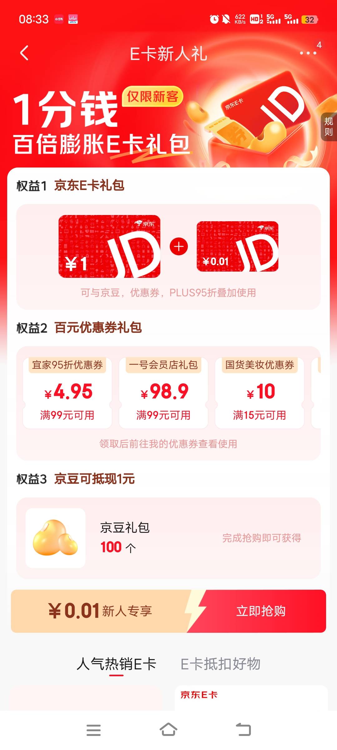 没有在东东买过E卡的,主页搜E卡一分购,点膨胀,可以0.01拿下,一个号可以领一次