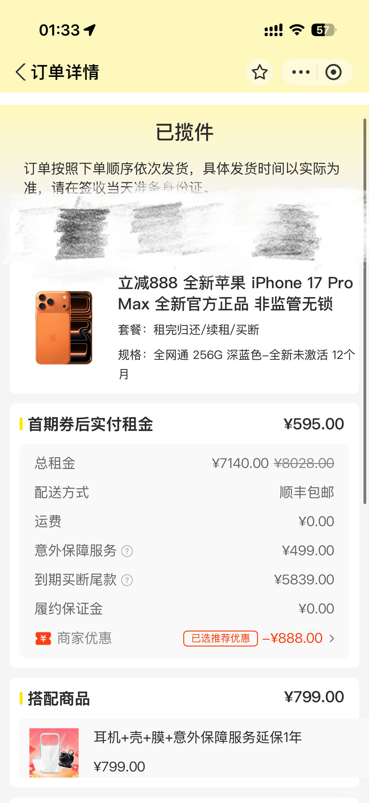 我17Promax要我1300加上首期租金595,不过没办法了,把过年这段时间熬过就好了