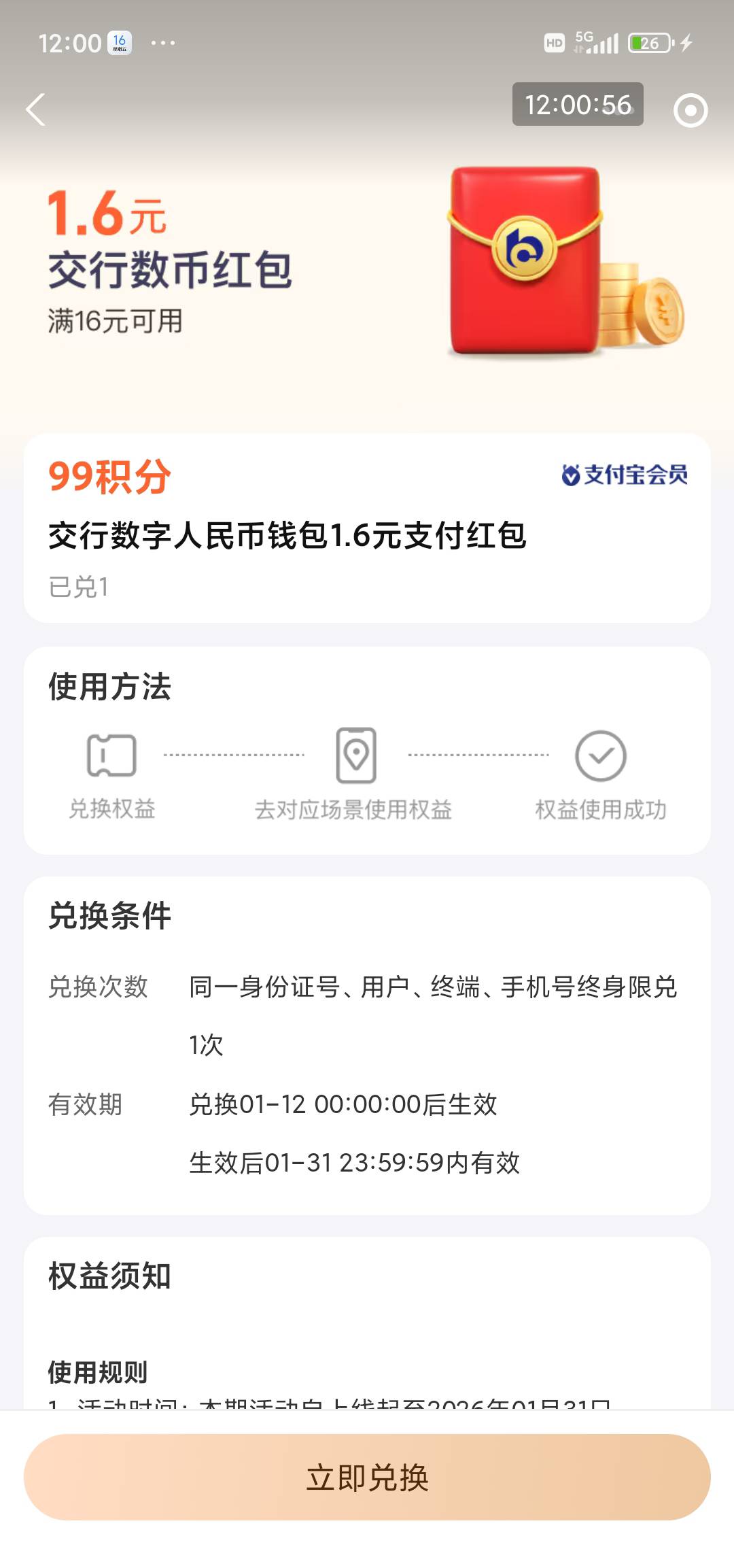 支付宝会员积分兑换交行数币红包活动