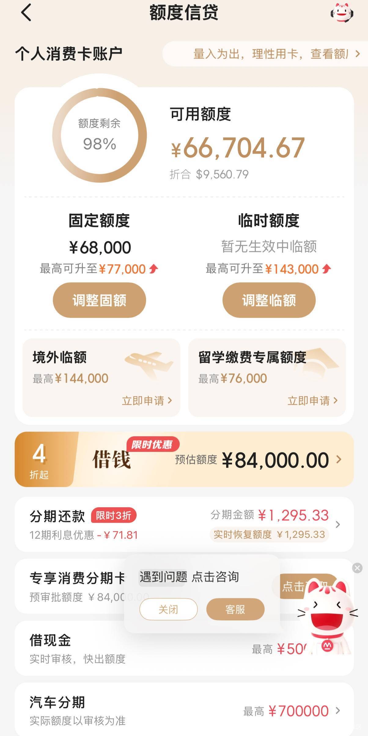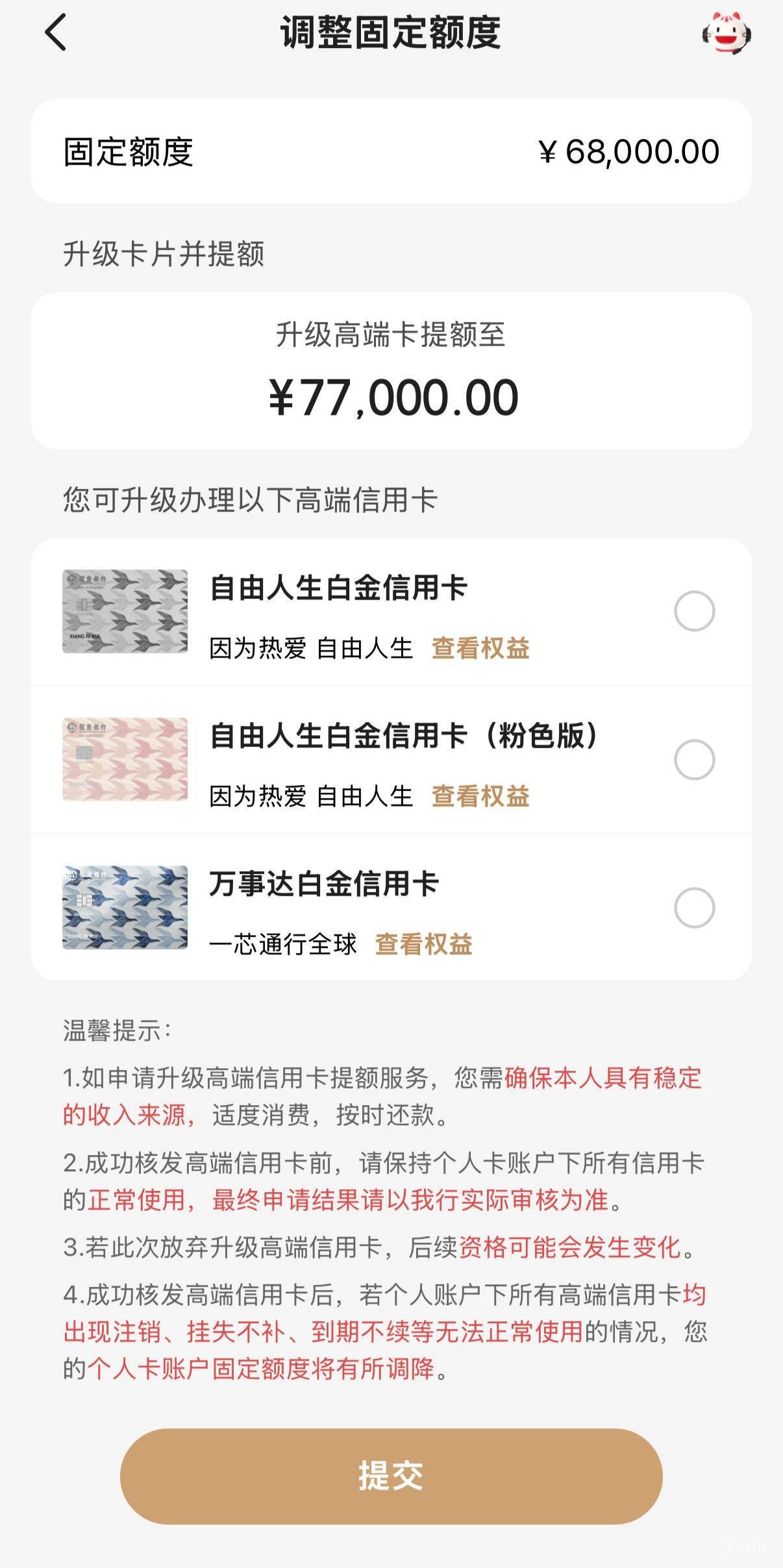 招商银行点提升额度就让升级白金卡,已经好几年了,白金卡一年 8 万才能免年费,我用