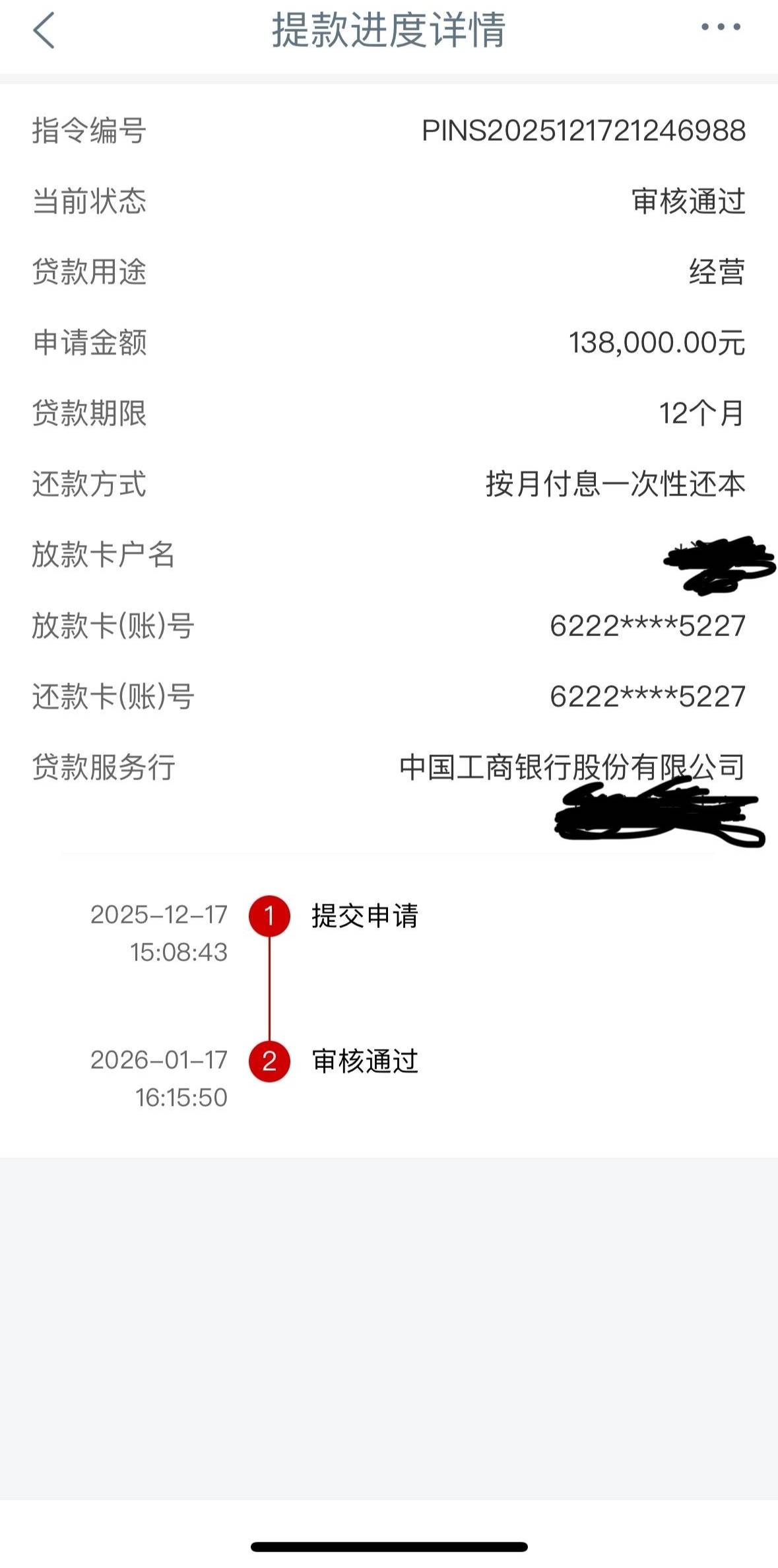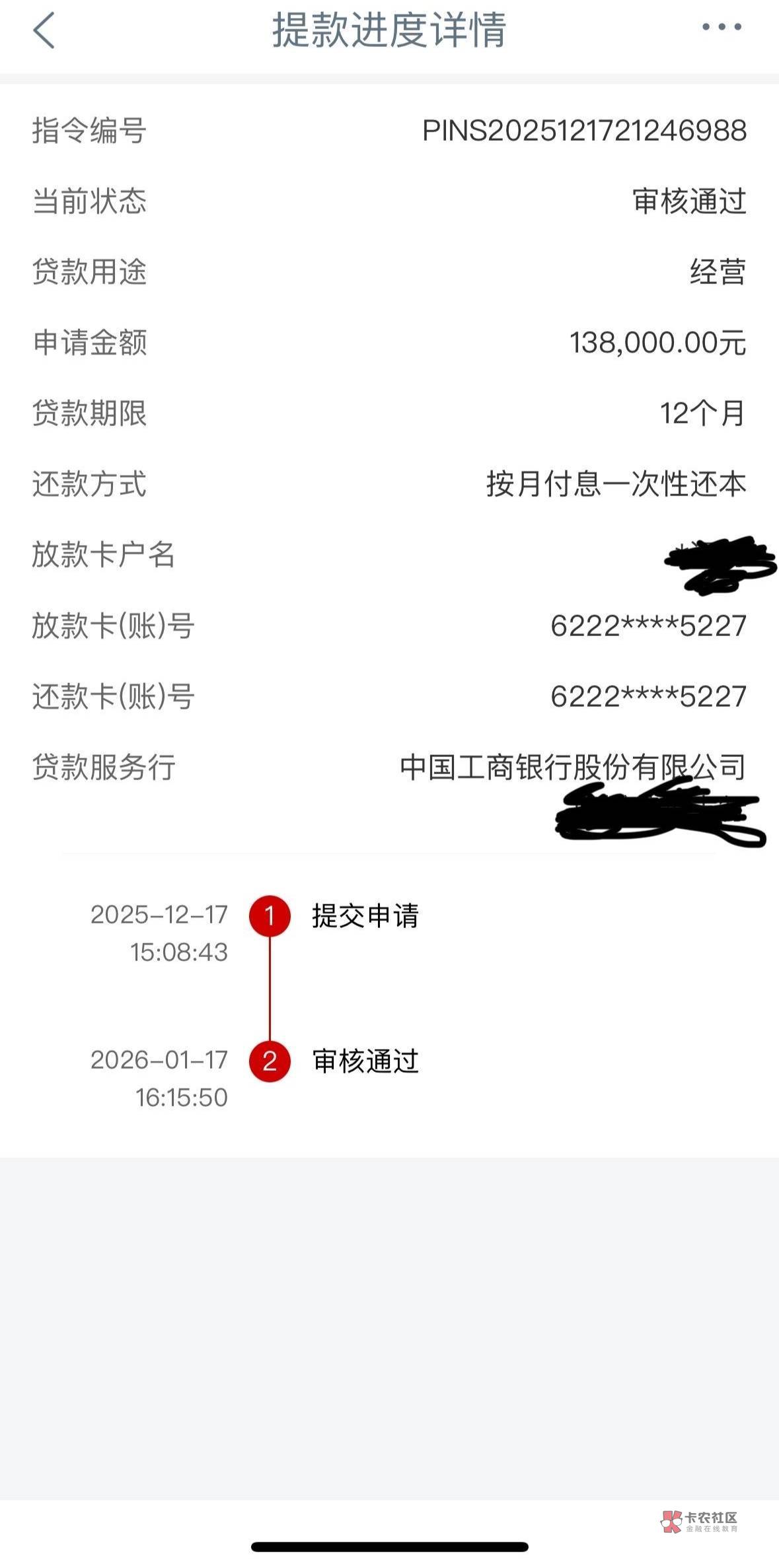 工行经营快贷下款了,3月份第一次申请,几分钟就下款了,但是只能使用六个月,9月还款后,再使用就一直审核中,一年查询24次,负债农行100万,信用卡15.6万透支90%,还有交通银行惠民贷8.9万,城市商业银行2.8经营贷,负债高,查询多,机构数多,我去工行二楼公司业务部让主任给取消申请,额度还在,12月17号申请还是审核中,周二客户经理和风险部主任双人下户,周四下午3点写报告,今天周六下午4点 15分工行经营快贷下款了,本人未婚单签,没有去行里签字,就在申请流程签的,没有流水,空营业执照,找的地方拍的,给兄弟们参考一下。