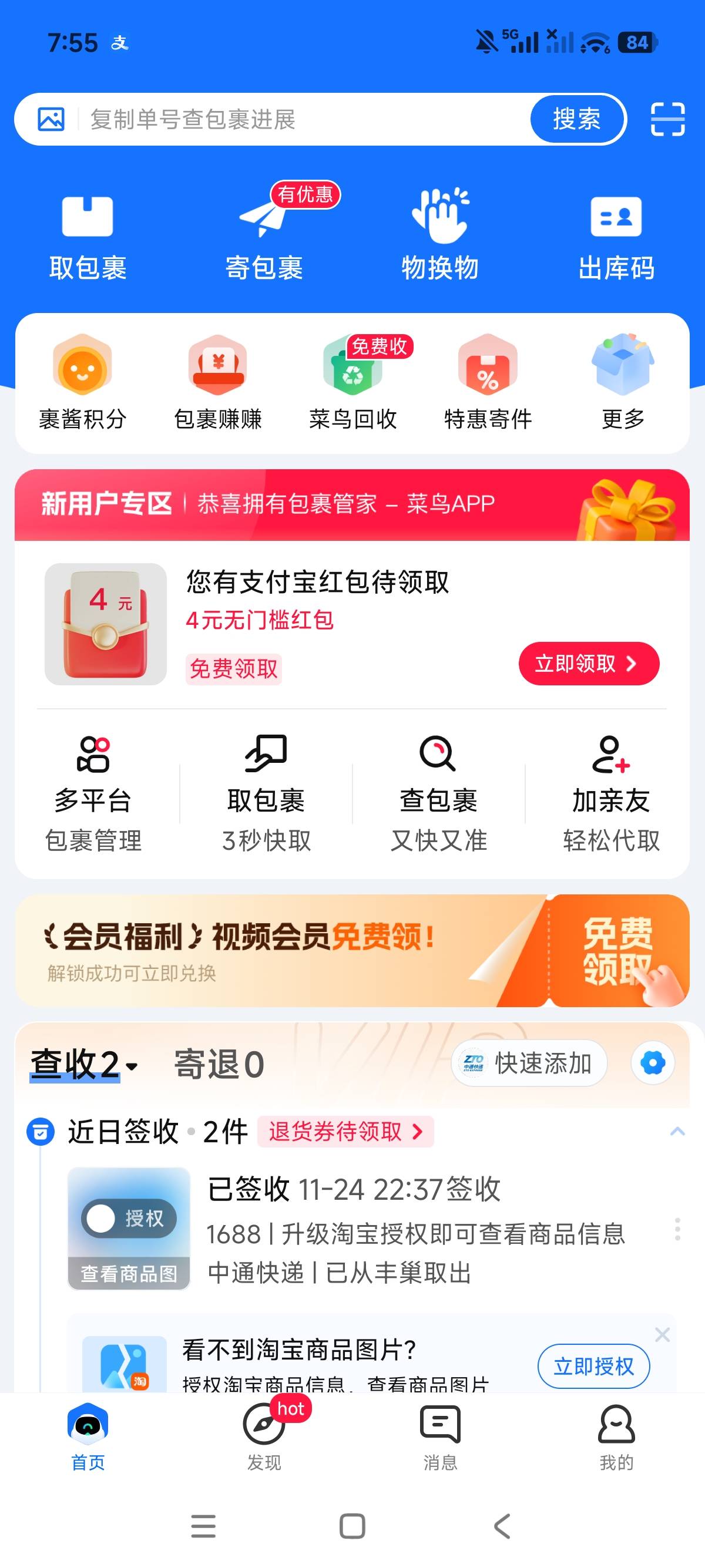 菜鸟新人专享礼4元支付宝现金红包活动