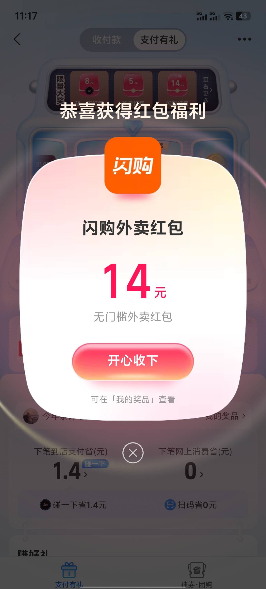 支付宝搜索支付有礼 顶部下拉抽刚中闪购14无门槛