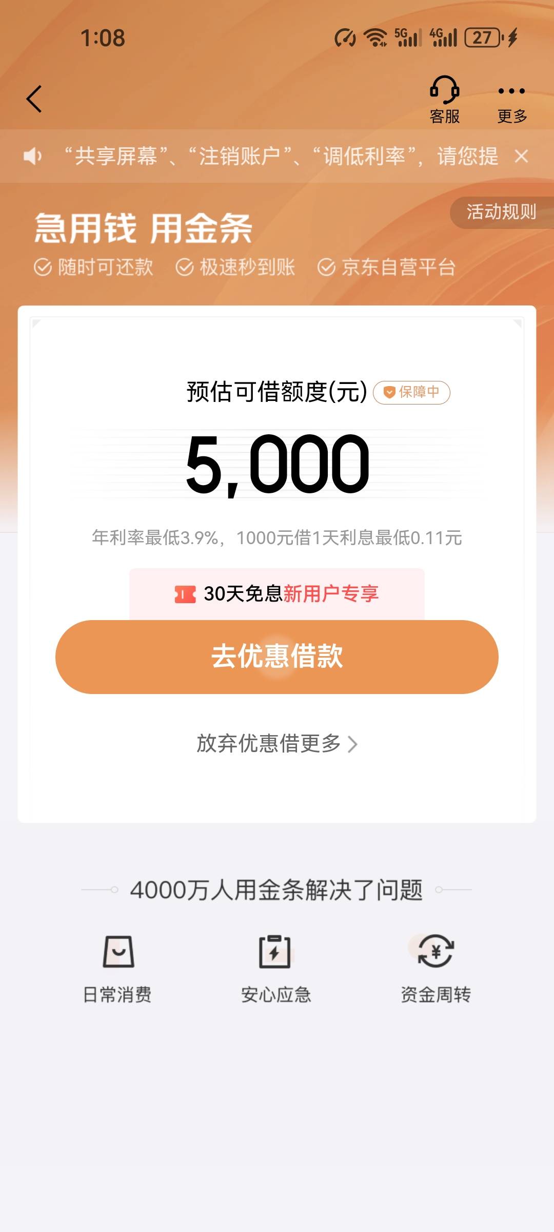 你别点金条,你点那个京东借钱,你看看里面有没有资方。如果有资方的话,你这个金条估计能下,如果没资方的话,金条肯定也下不了。