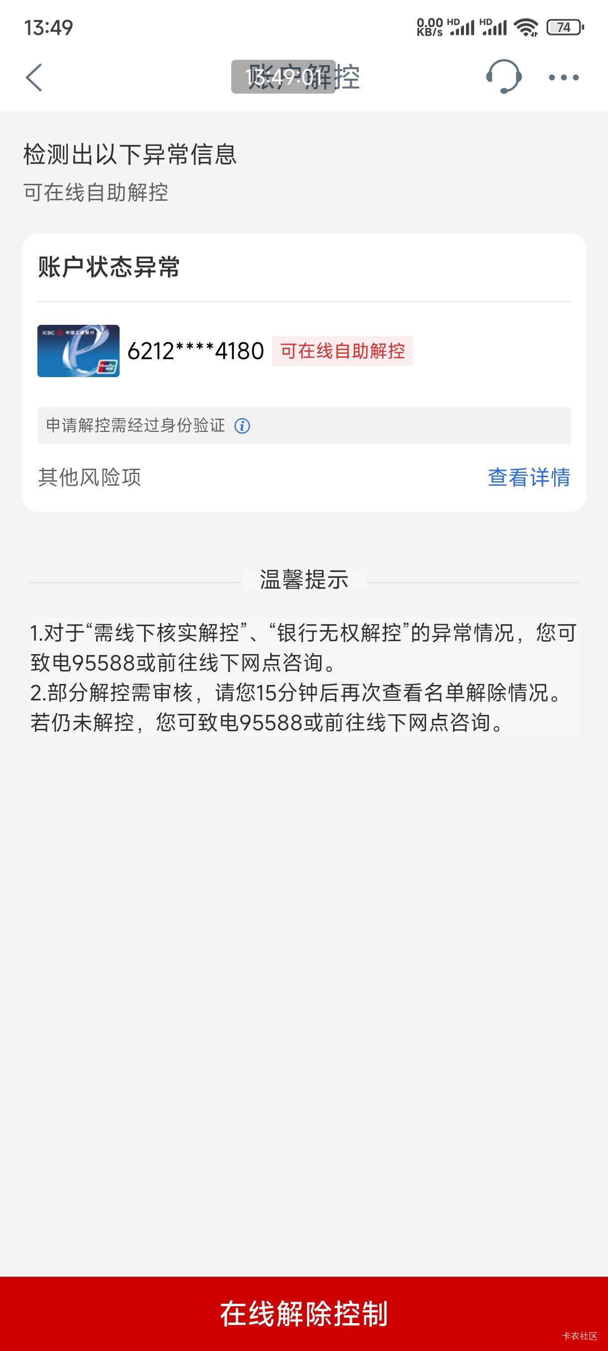 工行怎么这么恶心,对象号40万豆想着没预留想着直接开个卡,昨天开的存了100付了2块钱直接异常了,已经申请了能解开吗