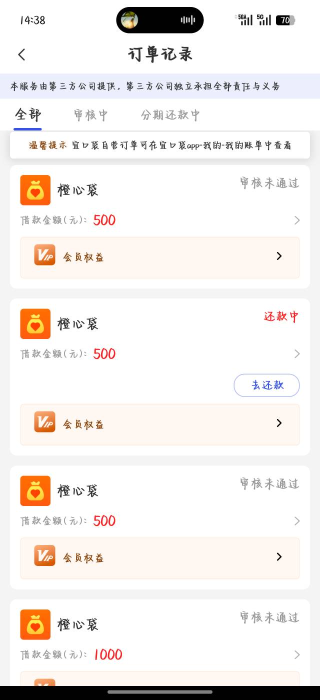 之前申请支付宝立减金也不给,申请橙心袋宜口袋无数次都秒拒,推了得有一周,今天闲着没事点了一下没管,后面客服来电话让我开通会员先用后付给我放500,果断开通,等了20分钟左右下款。