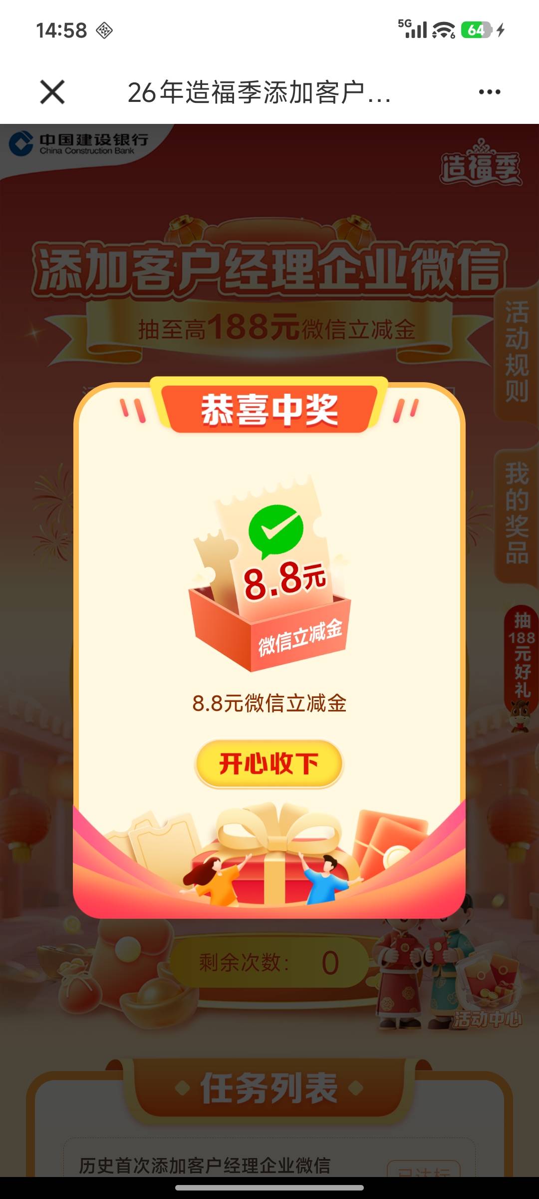 建行添加客户经理企业微信抽微信立减金活动