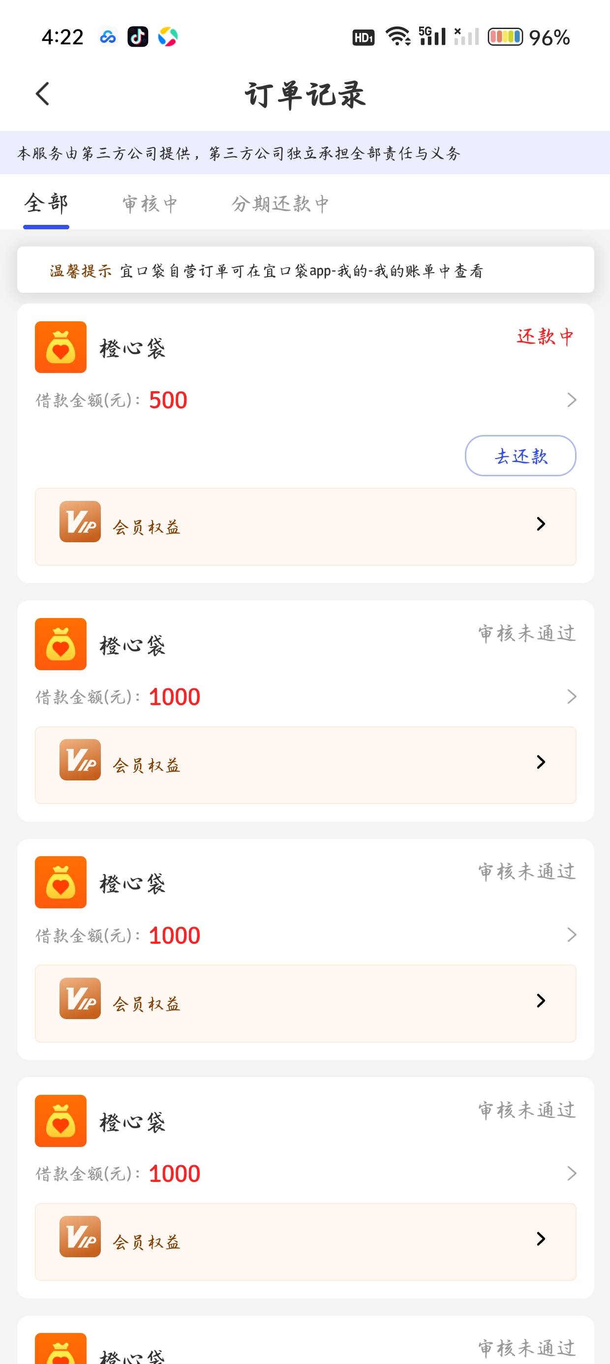 宜口袋今天给我发短信说我有1000可提现,之前试过但都被拒了,看到这条短信后还是想抱着试一试的态度去申请一下,登进去后首页显示第三方平台橙心贷有1000的额度,提交申请后过了一会发条短信说我资质有问题,额度降到了500,然后一直显示在放款中,就是不放款,再过了一会儿一个电话打过来让我开通什么会员的先用后付,56块,我开通后过了一会儿就放款了。