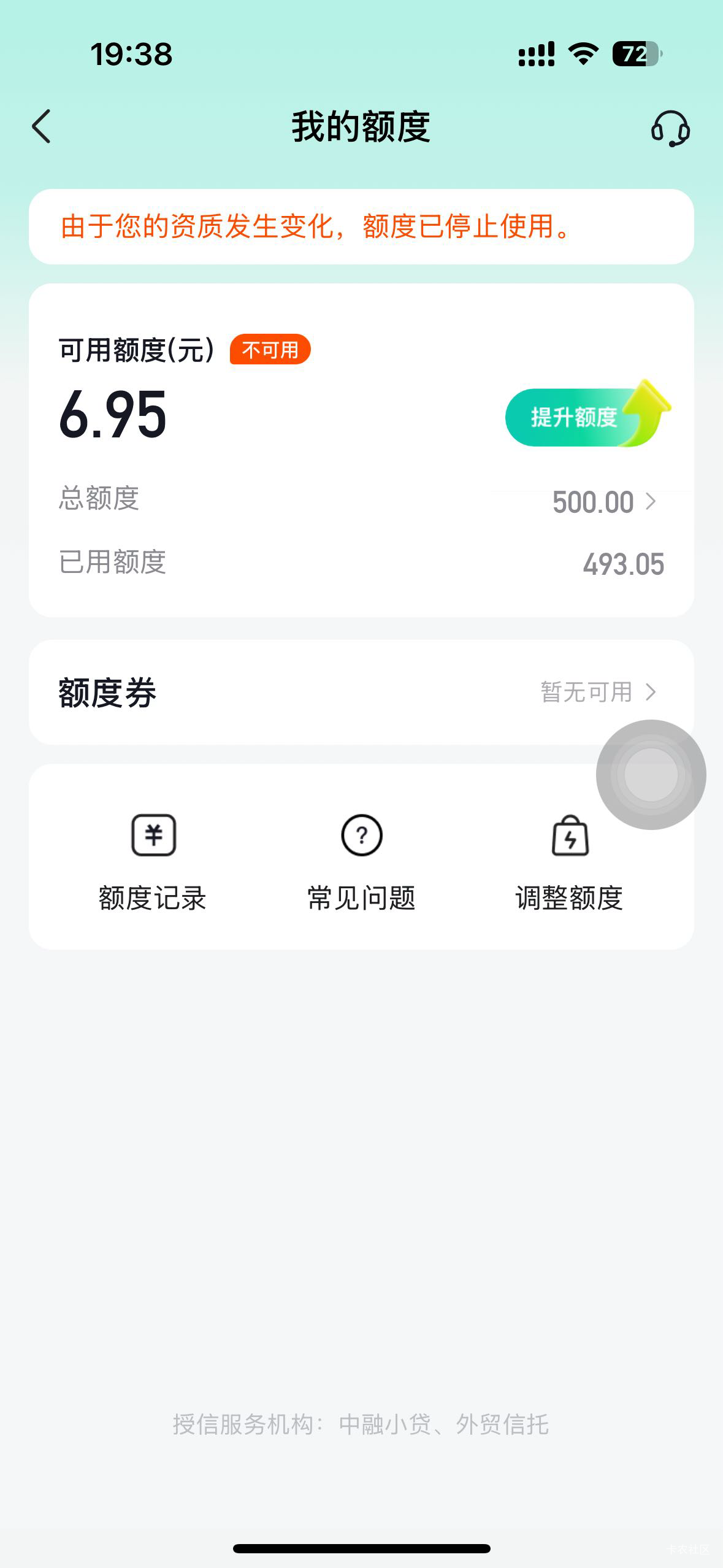 这很是让人伤心啊,上个月还是1000额度也是这种不能用了,这个月初关闭重开变500 全弄出来了  今天去看又不能用了,以前还时不时给两三百临时额度 现在直接不给用。