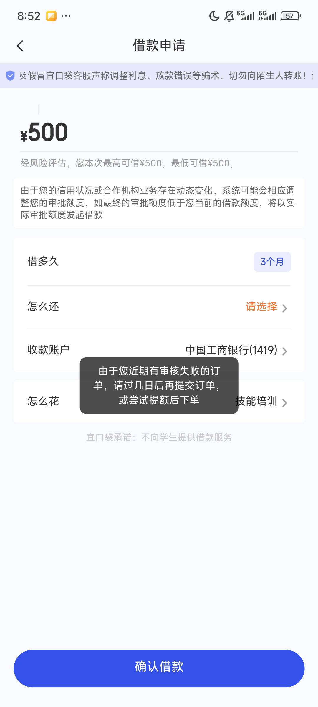 宜口袋重要提示。7点多就提示过。下过一次的额度超过一千可以审请第二次。。第三次不