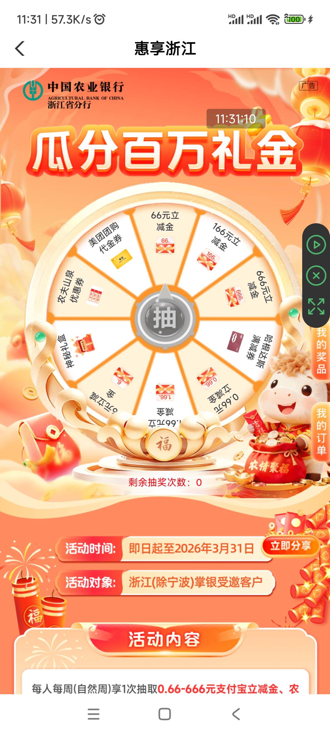 老农浙江城市专区瓜分百万礼金,花不完。