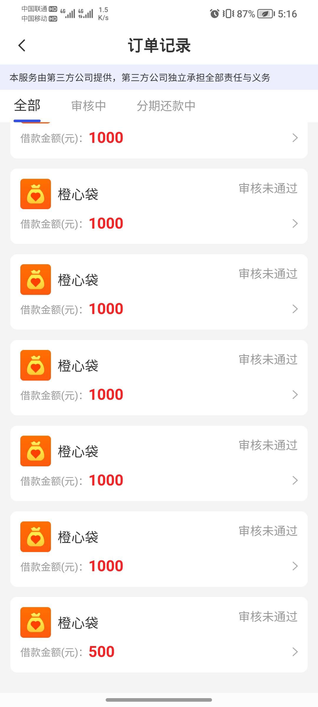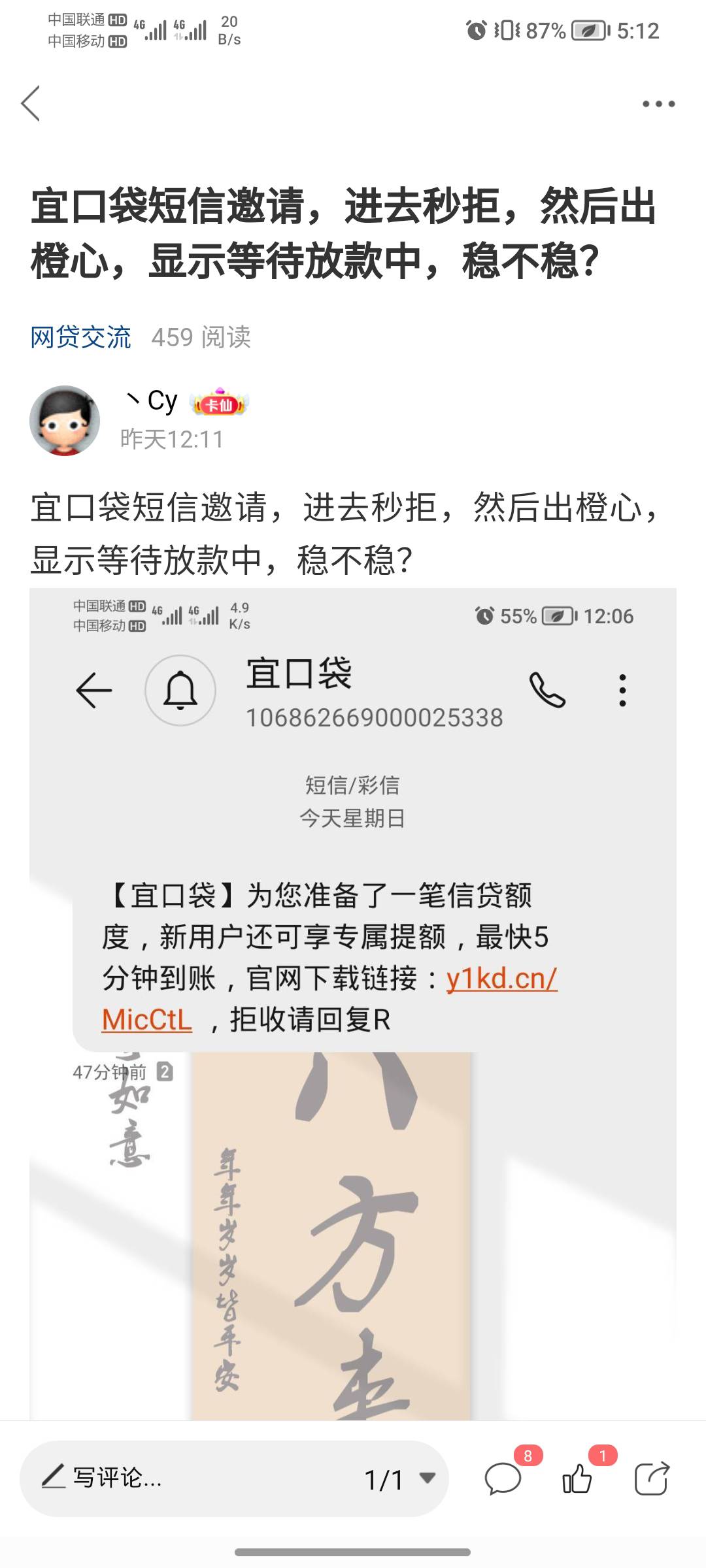 宜口袋,一次小惊喜,还以为没过呢,谁知道睡醒自己到账了,扣了个69.9,从短信下载进的,平台借款500过了,橙心袋1000还在推中,个人有一笔呆账,没想到能下款,差不多一天多时间,昨天中午申请的。
