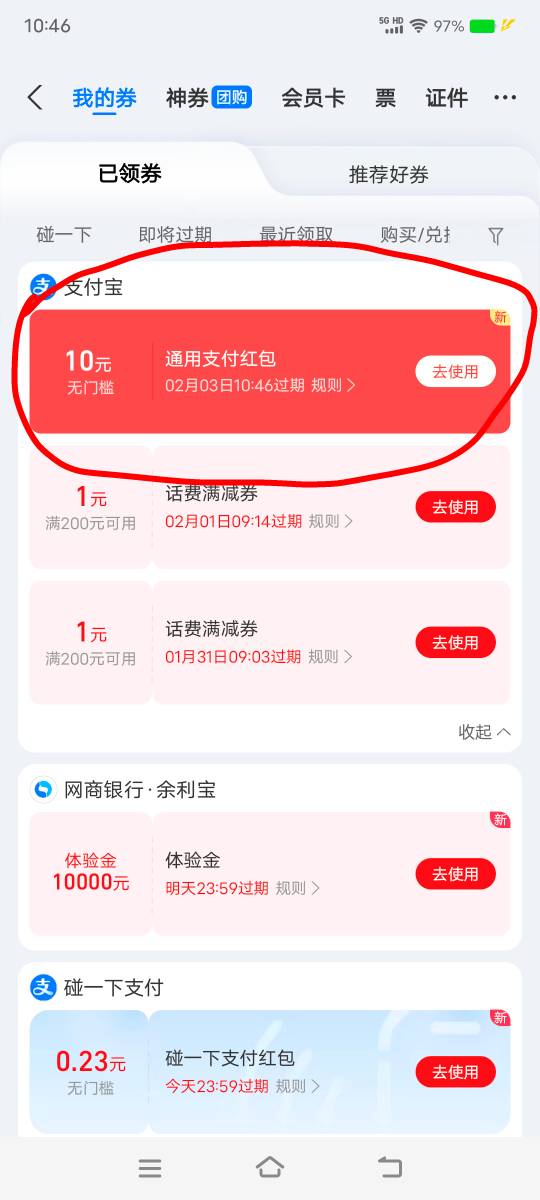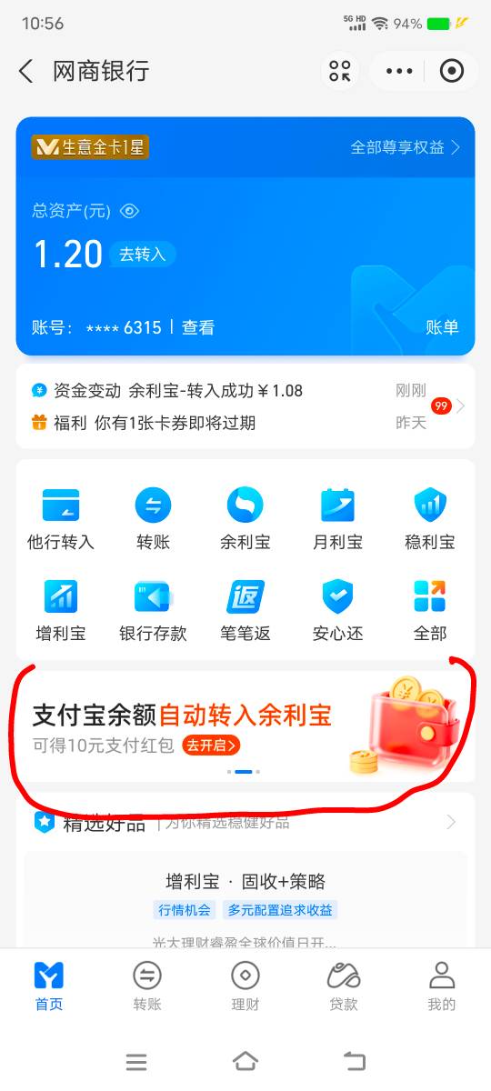 zfb网商银行余利宝页面弹窗,开通余额自动转入领10毛,破零了