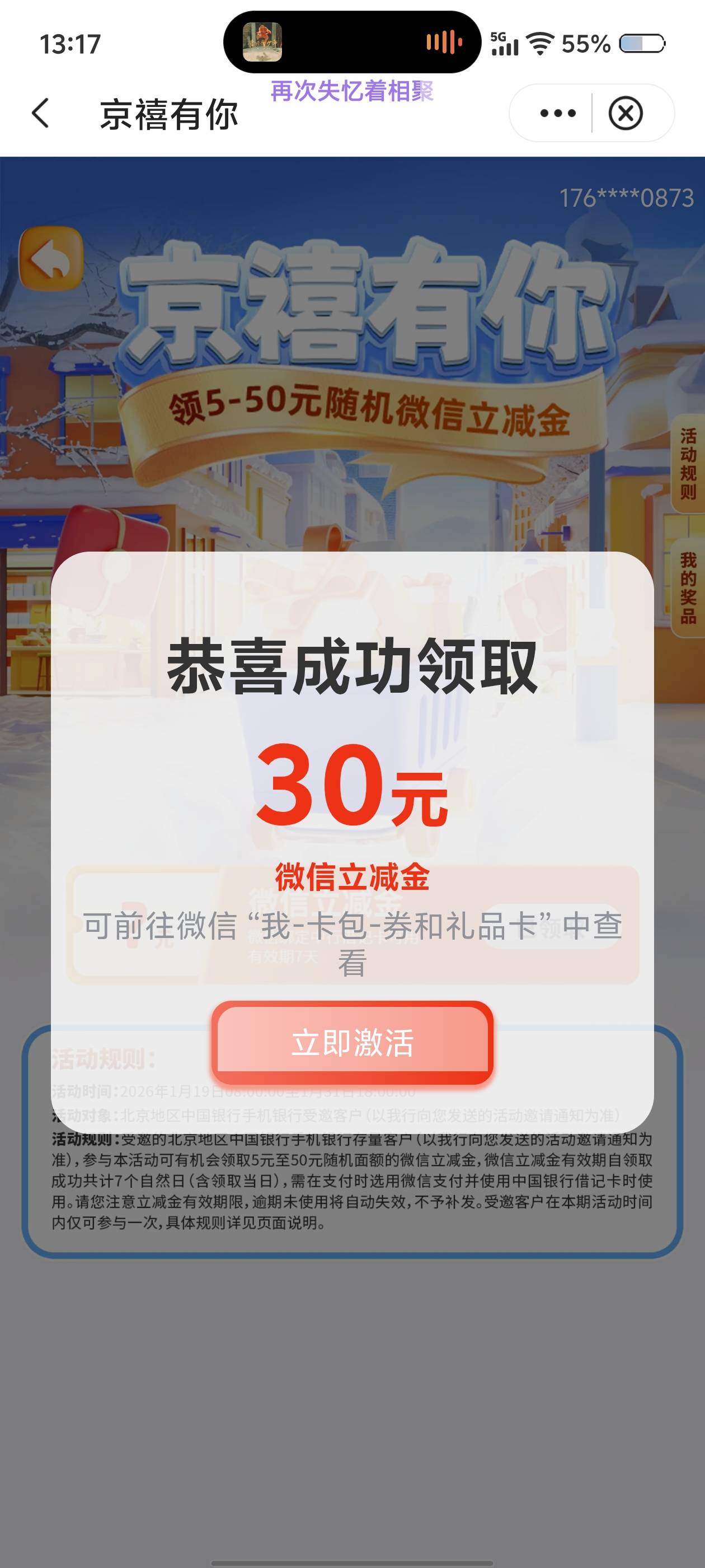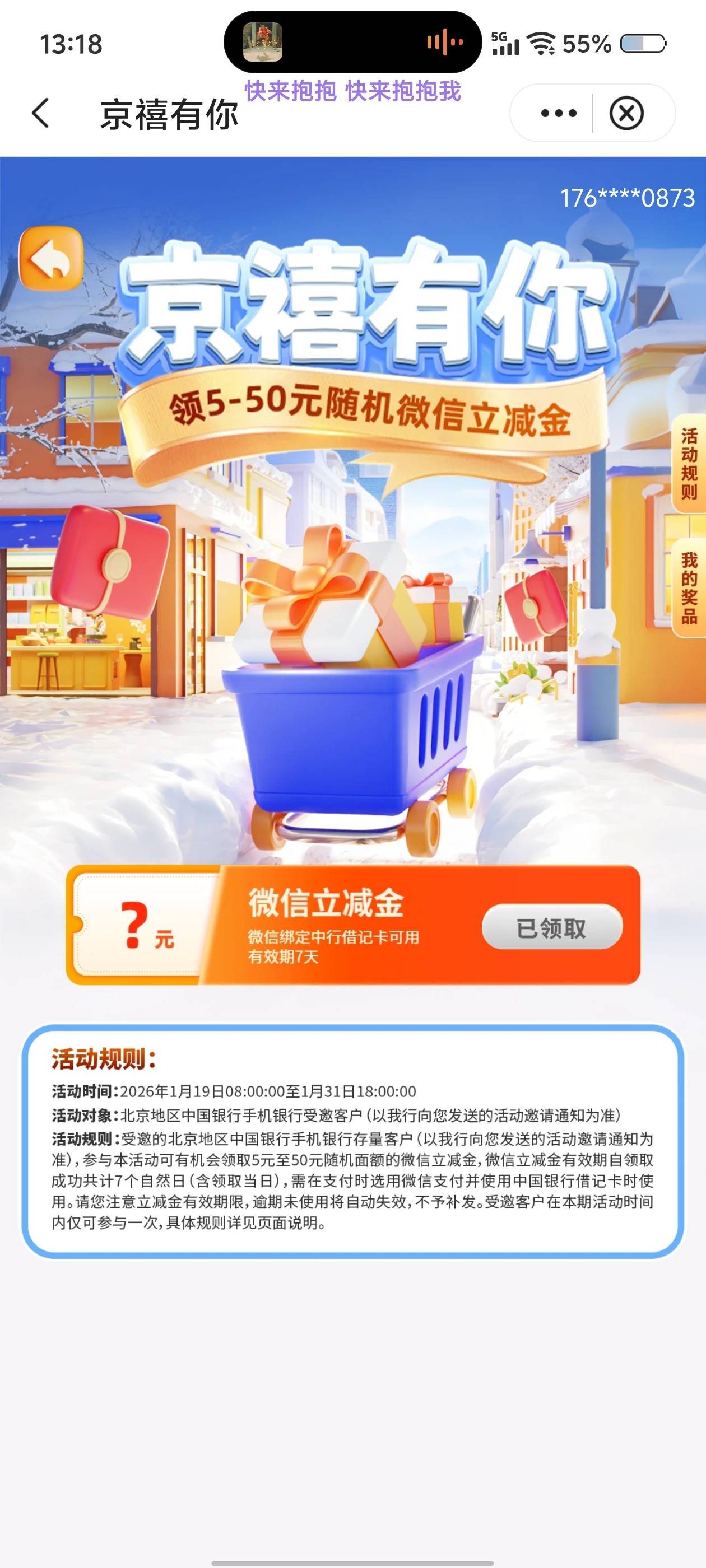 中行北京京禧有你领微信立减金活动