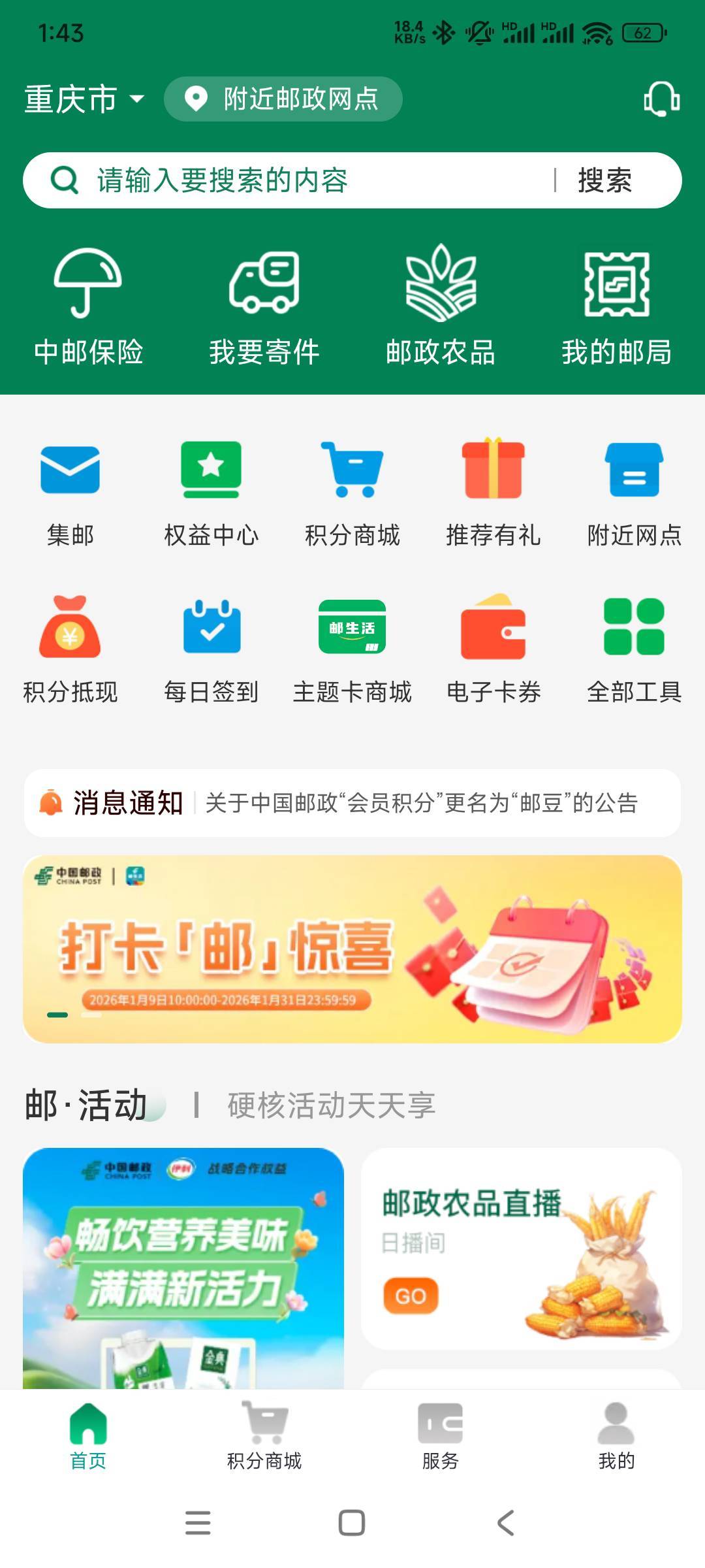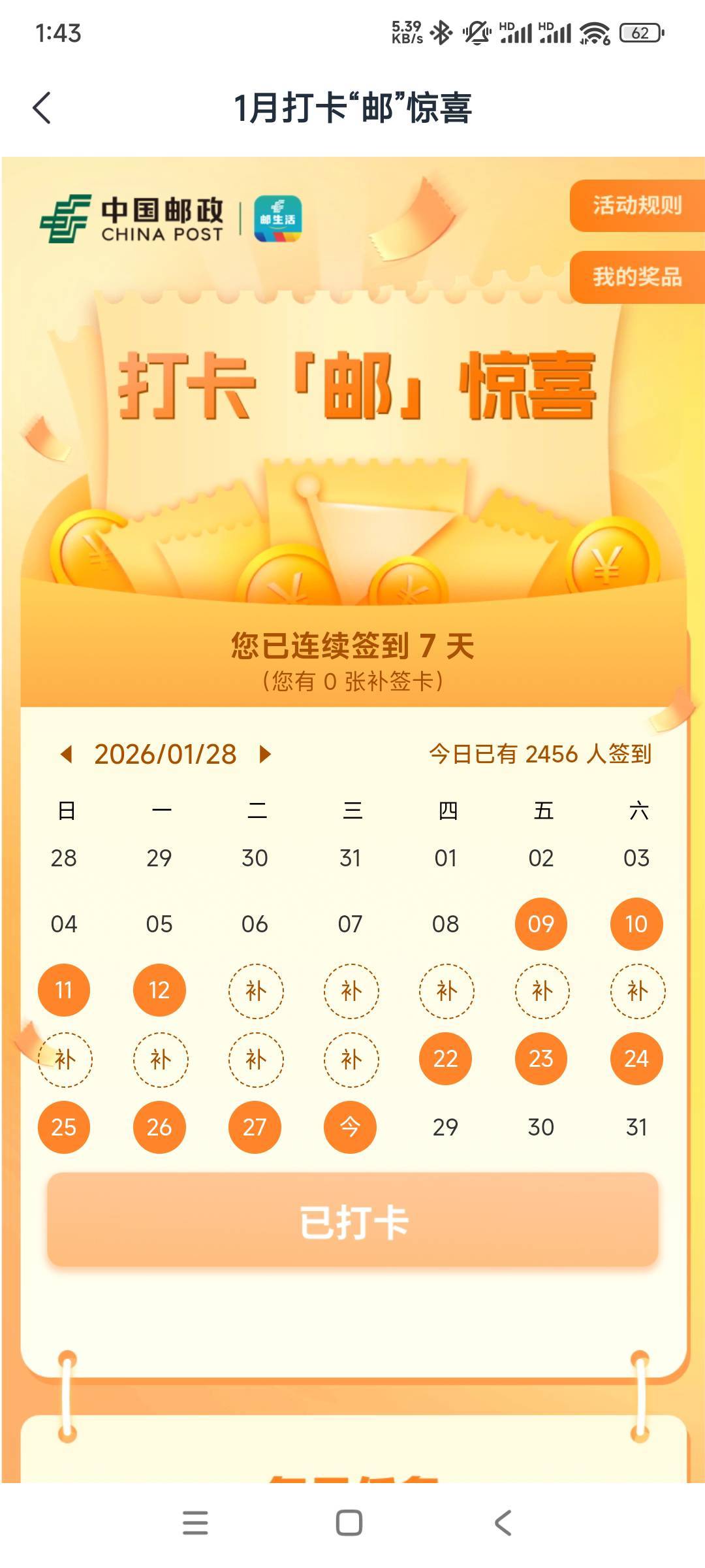 邮生活app打卡7天:抽微信立减金