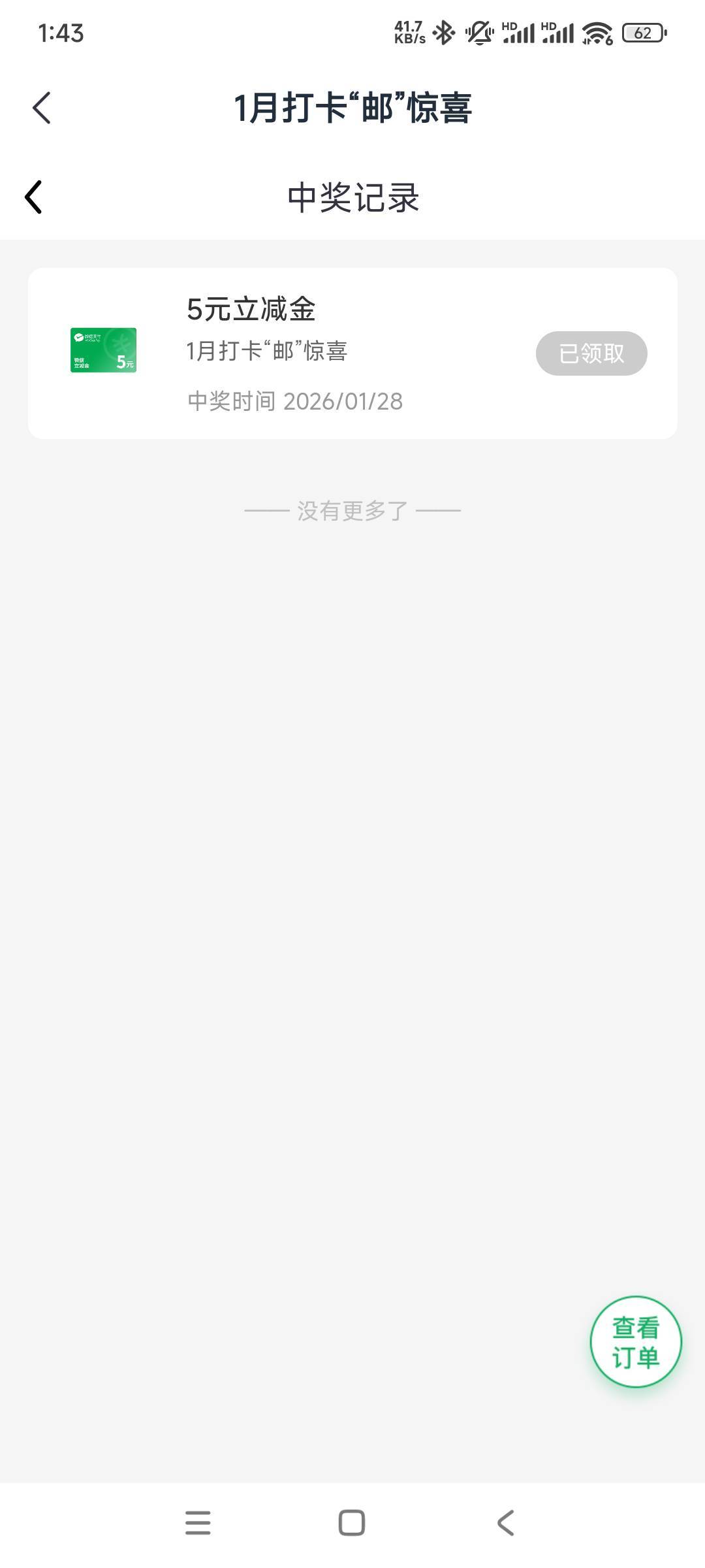 邮生活app打卡7天:抽微信立减金 随意打卡7天,抽到了5元微信立减金。
