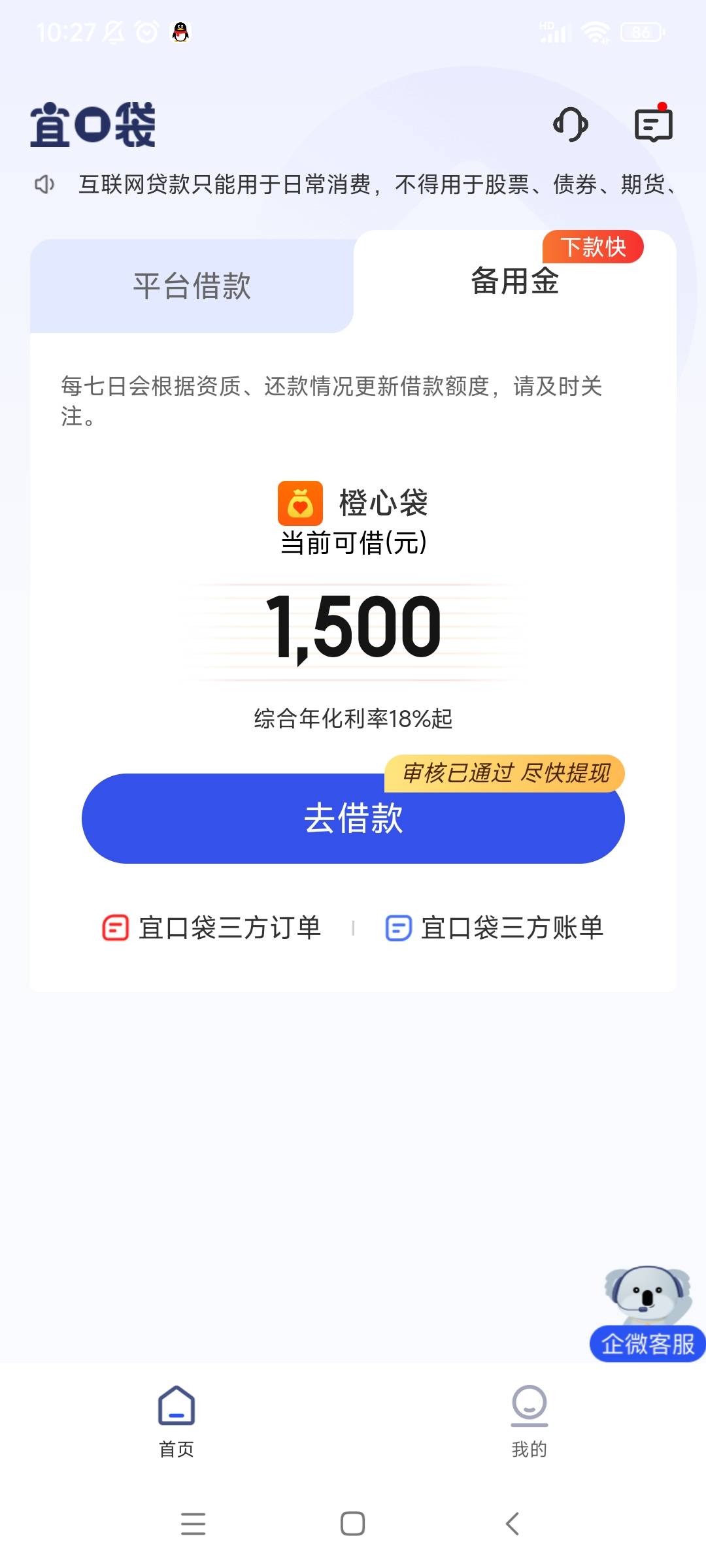 今天宜口袋立减金还款期到了,橙心袋下了500扣了一期,橙心袋现在本体还有1500,过几天还有会在下500大洋,宜口袋本体还有1000额度的借款,大概距离上次宜口袋本体借款拒了有7天了,明天好像可以在申请了