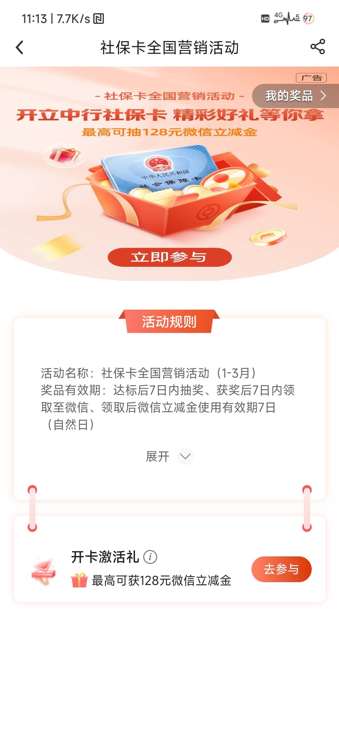 中行深圳社保卡激活礼40也能领了,开卡+激活一共100,全国抽奖参加不了应该是上一年开