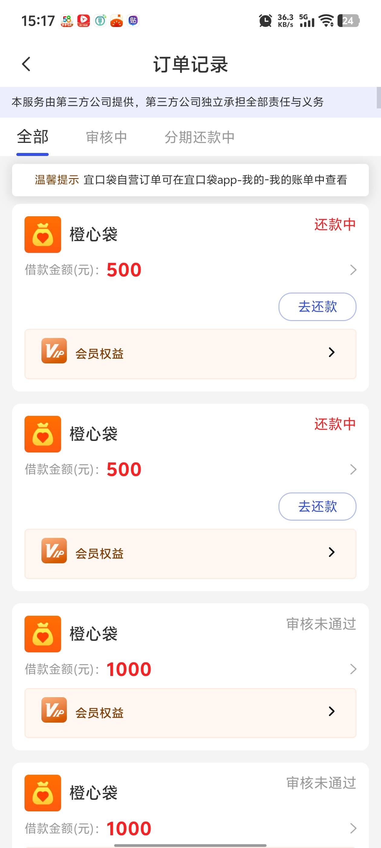 老哥们,橙心袋第二笔下了,今天还款日,上午10点多钟放款了,秒扣立减金,看着还有50