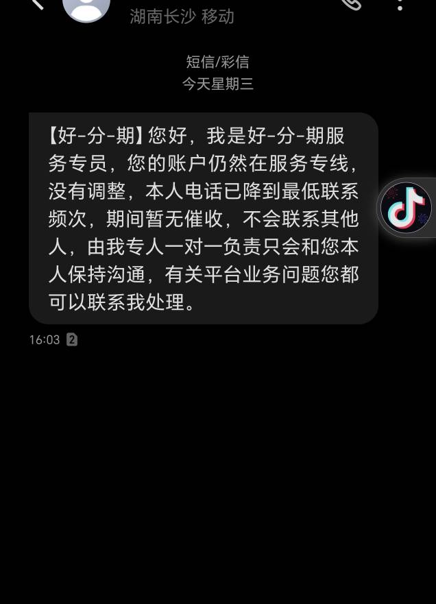 这是什么情况?没联系过好分期客服。前天逾期就给我打了个电话,我接起来没说话,对方挂了。挂了后给我发短信,今天又来了个电话响两下挂了 又给我发这短信
