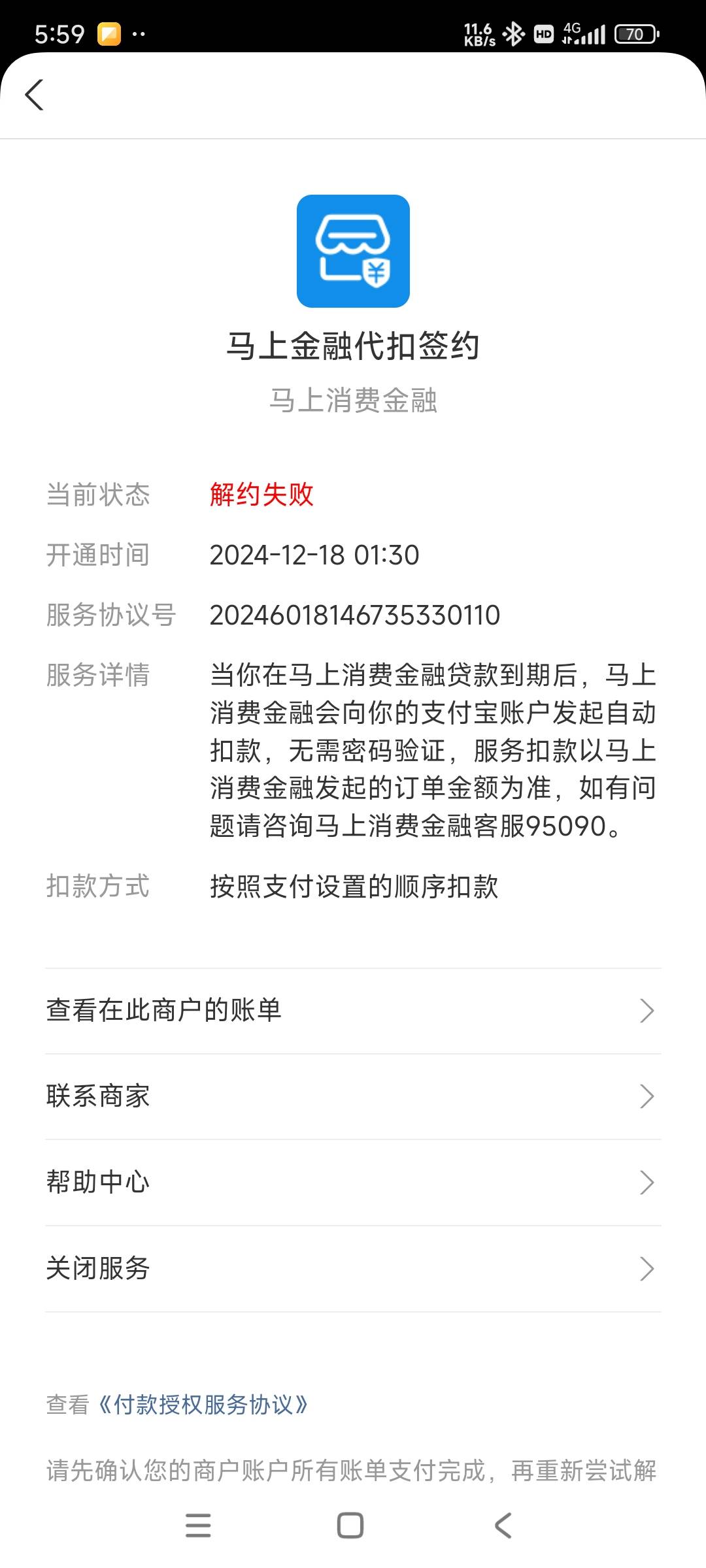 有没有老哥找支付宝客服关闭过马上金融的代扣?这个自己关不掉,点关闭就失败