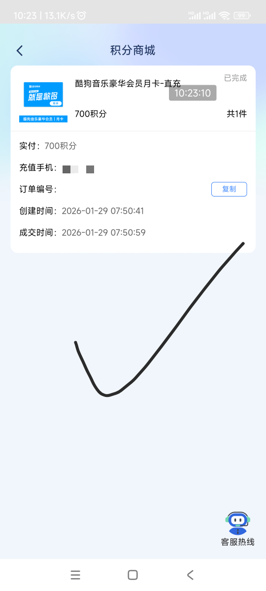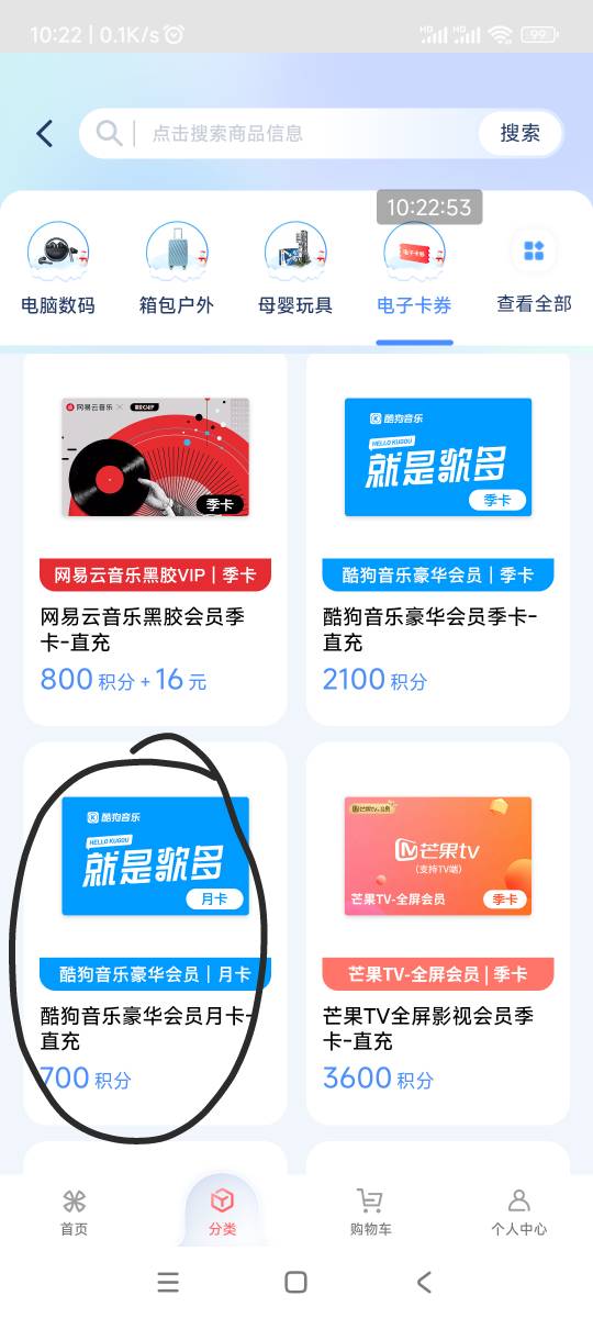厦门国际YH,积分商城,电子卡券,700积分兑换酷狗音乐月卡,代充10.5毛。