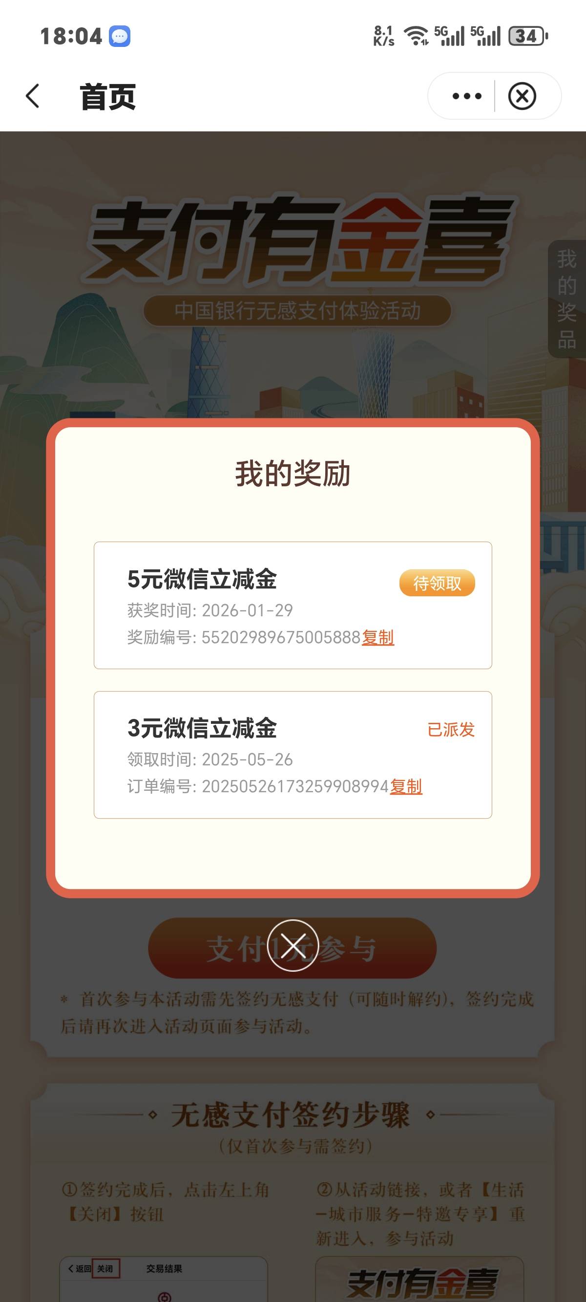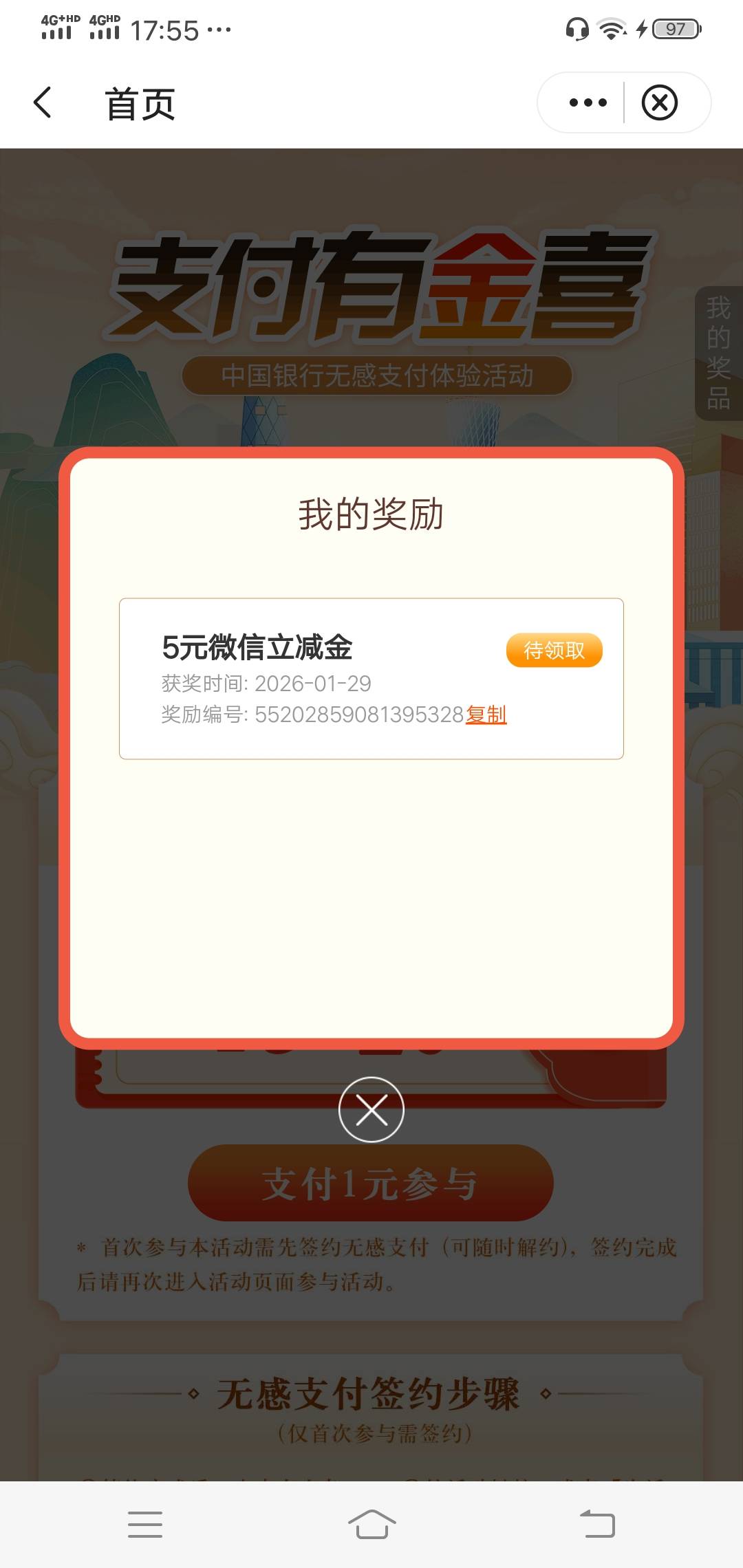 中行广州城市专区 特邀专享 签约无感支付 我也没有短信看到就进去签约领了