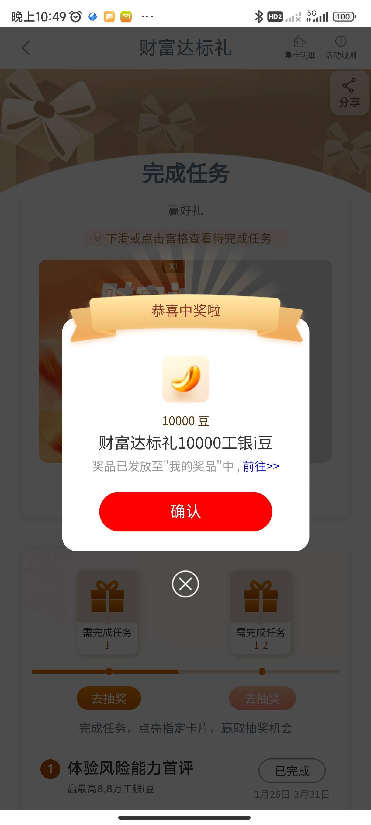 工行任务,财富达标礼第一个,1万豆到手。10个大毛