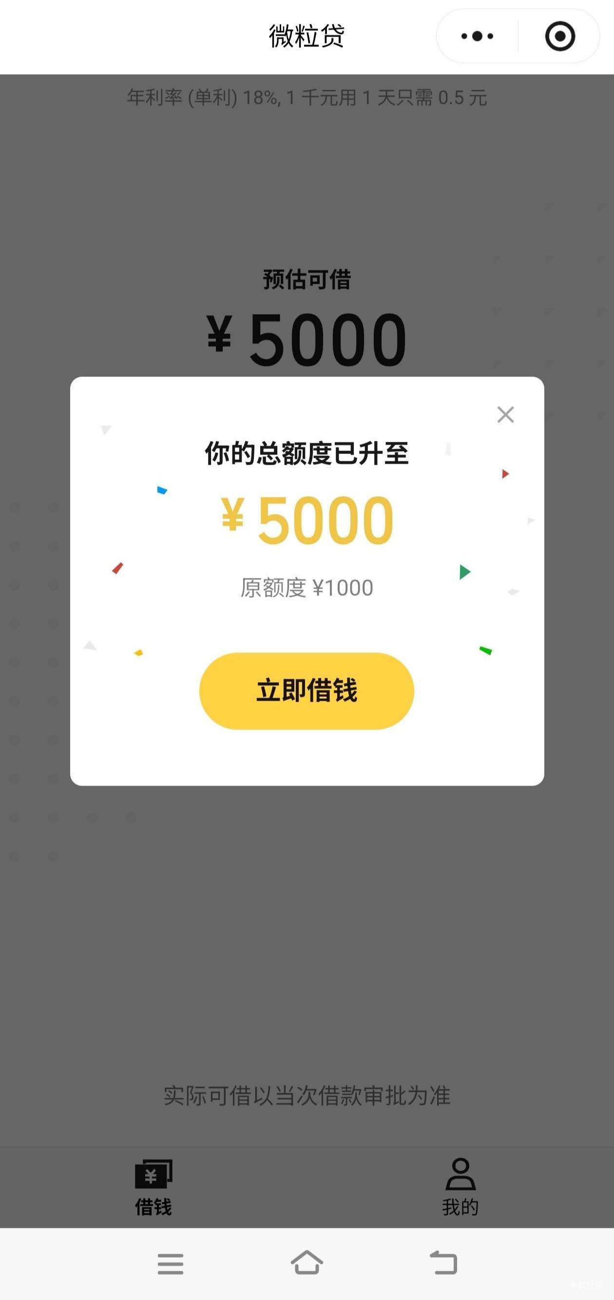 微粒贷下了,微粒贷从来没有抽贷过。就是一直都是1000额度,从有微粒贷我就一千额度,一直没变。上个帖子说了一天点了十来个网贷,不是没额度就是秒拒。今天微粒贷提升额度了。早点提,我养了几个月的征信也不用点了。到底这些平台看重的是什么玩意。