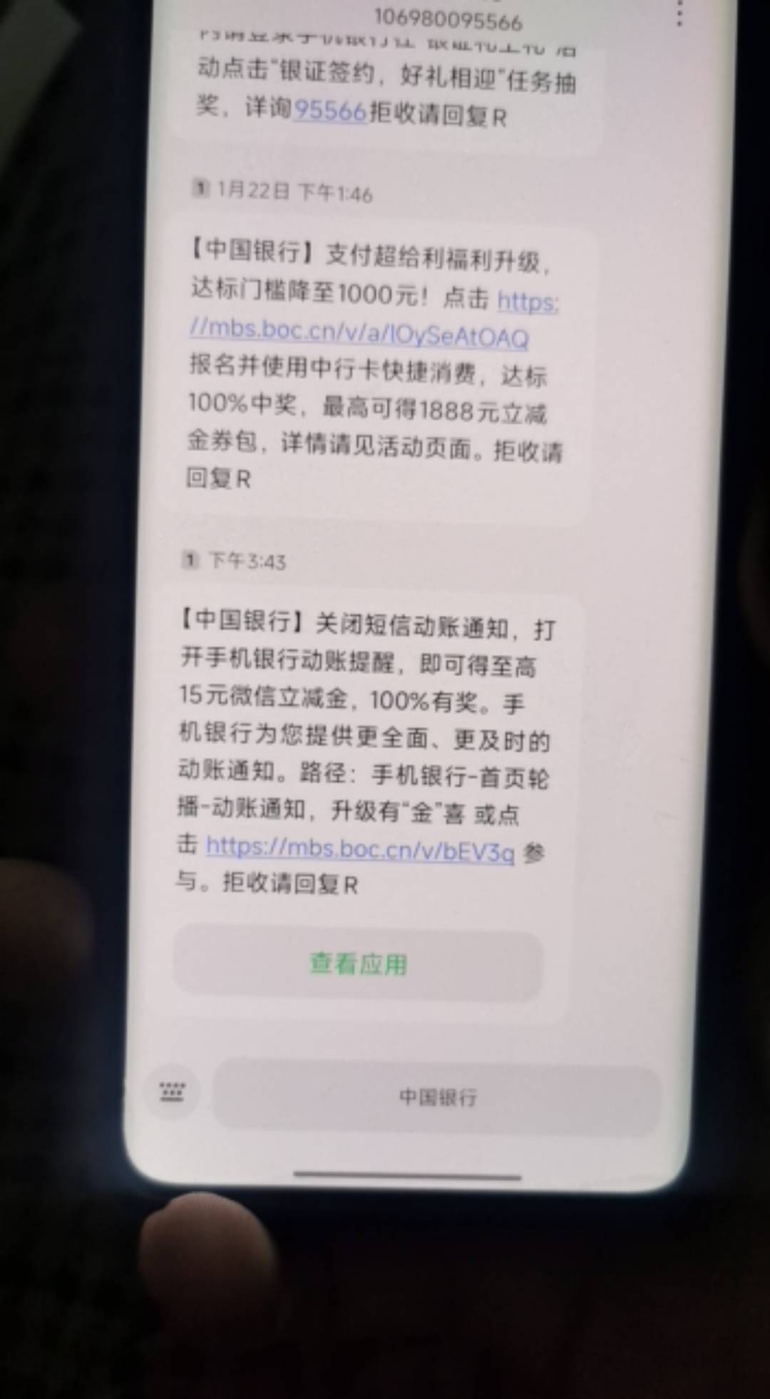 中国银行】关闭短信动账通知,打开手机银行动账提醒,即可得至高15元微信立减金,100%有奖。手机银行为您提供更全面、更及时的动账通知。路径:手机银行-首页轮播-动账通知,升级有“金”喜 或点击 https://mbs.boc.cn/v/bEV3q 参与。拒收请回复R