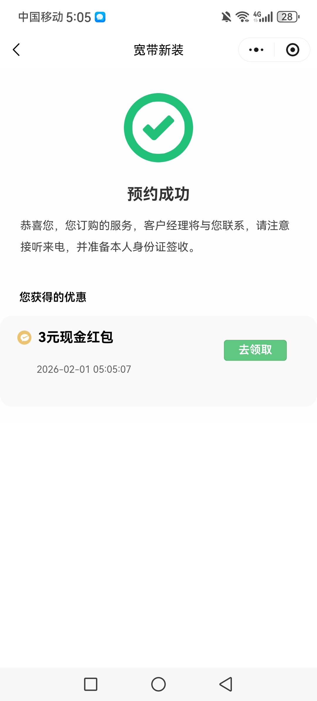 宽带中心小程序预约领3元现金红包活动
