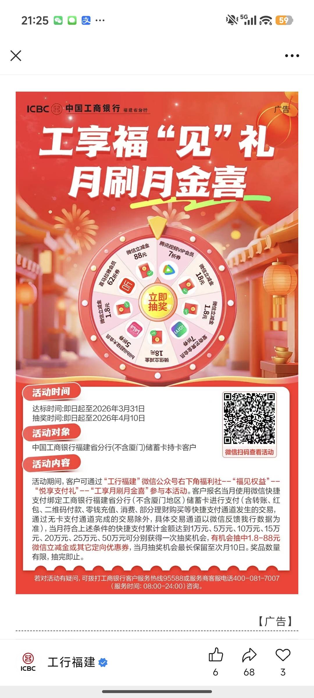 工行福建工享福见礼月刷月金喜活动