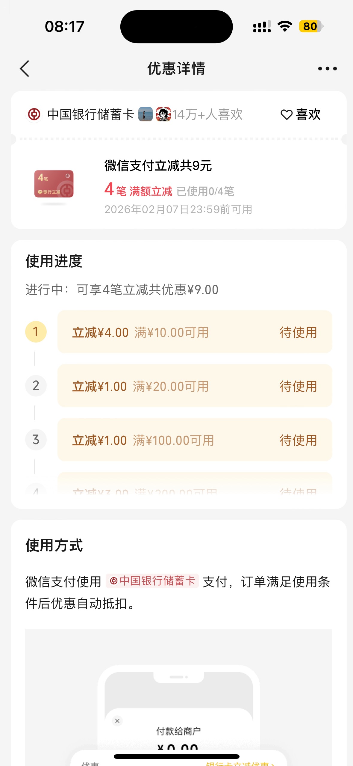 微信摇一摇中行微信支付多笔立减活动
