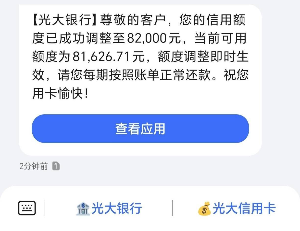光大第二次提升额度,卡了几年了,幅度这么大。从2万3提升额度到8万2。