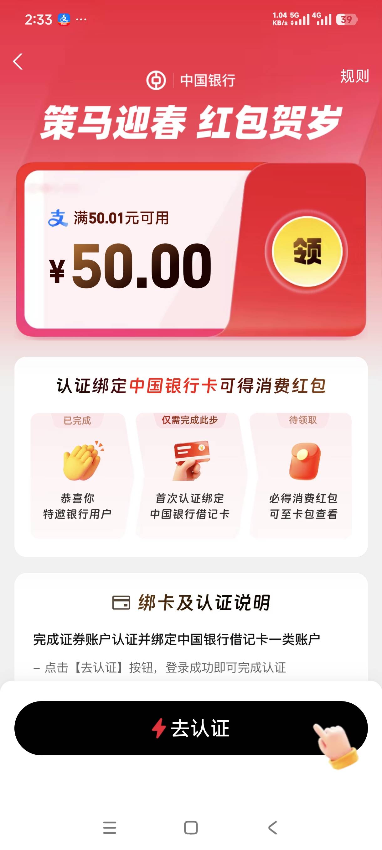 支付宝认证绑卡中行三方存管领红包活动
