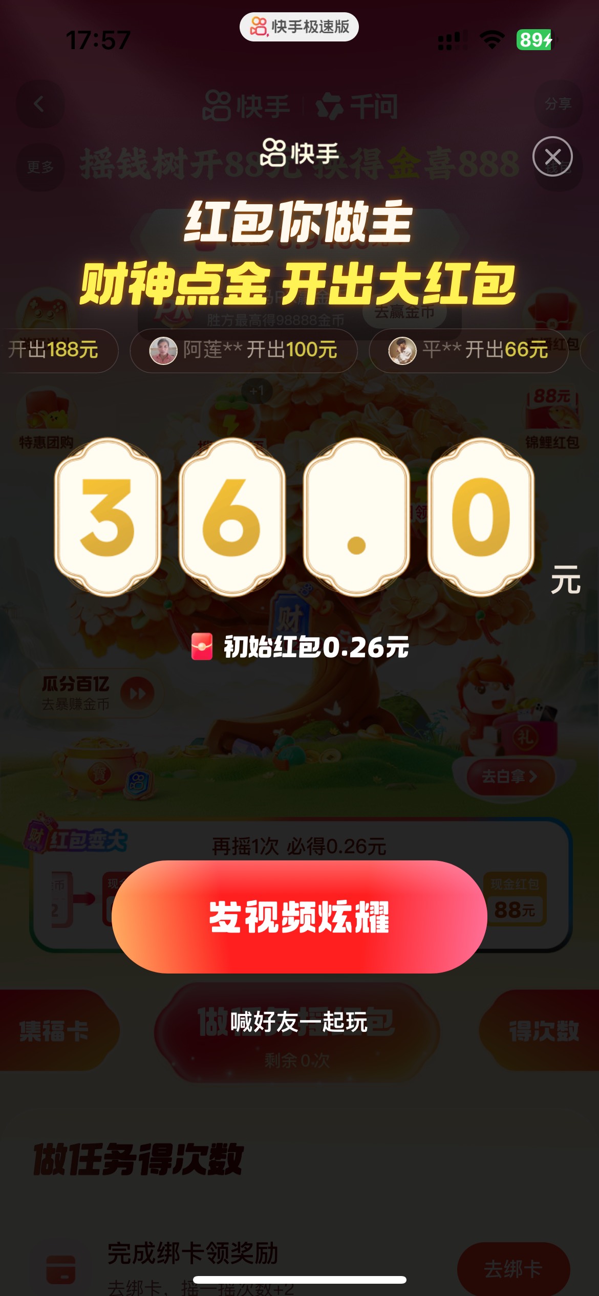 一直做任务摇到财神卡 大一点的现金红包就膨胀