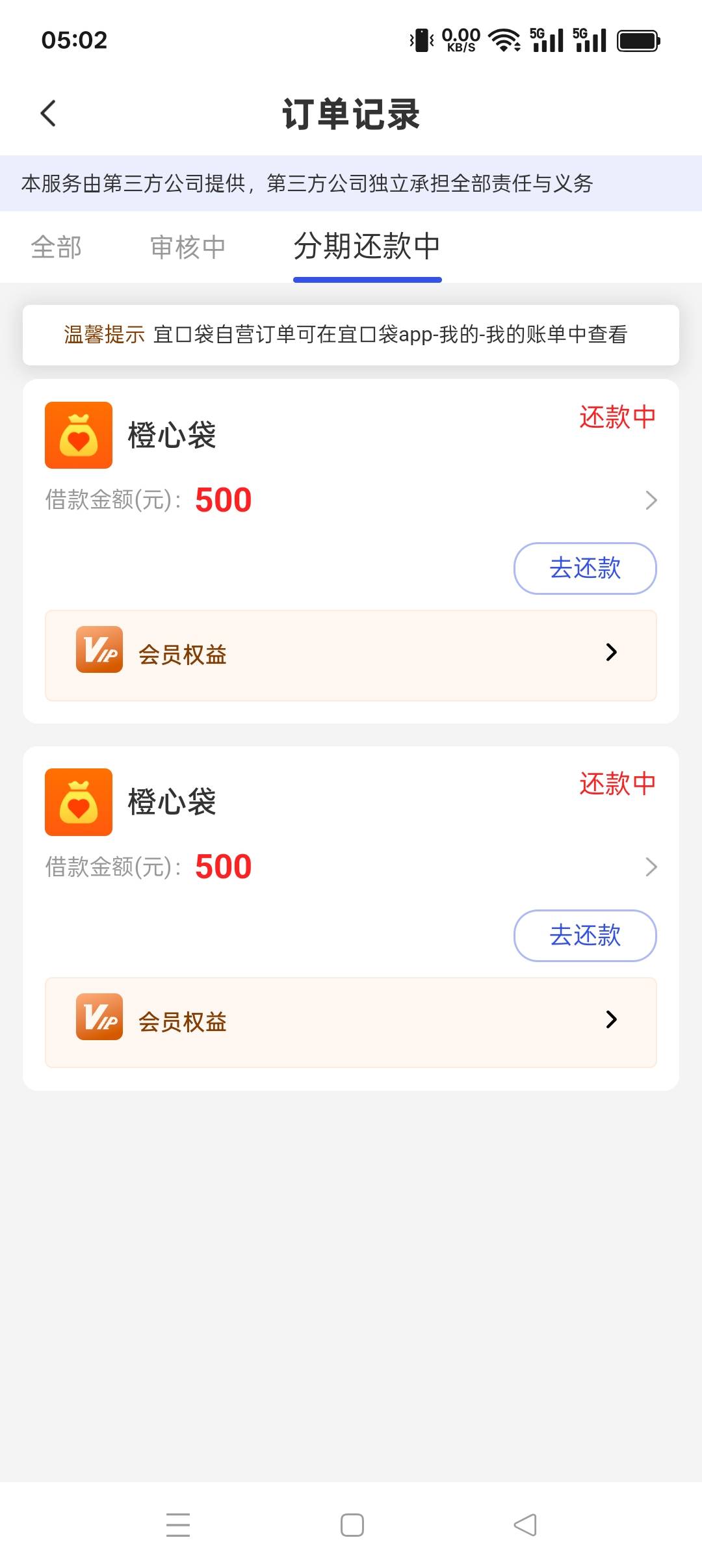 橙心贷第二笔下了,果然还是还款日夜间下款,看了很多老哥的经历,没设置拦截,扣了会员费跟第一次第一期的还款,我怕他不给我第三笔,有经验的老哥们,我明天接着点申请还是等下一个捐款日@管理加精