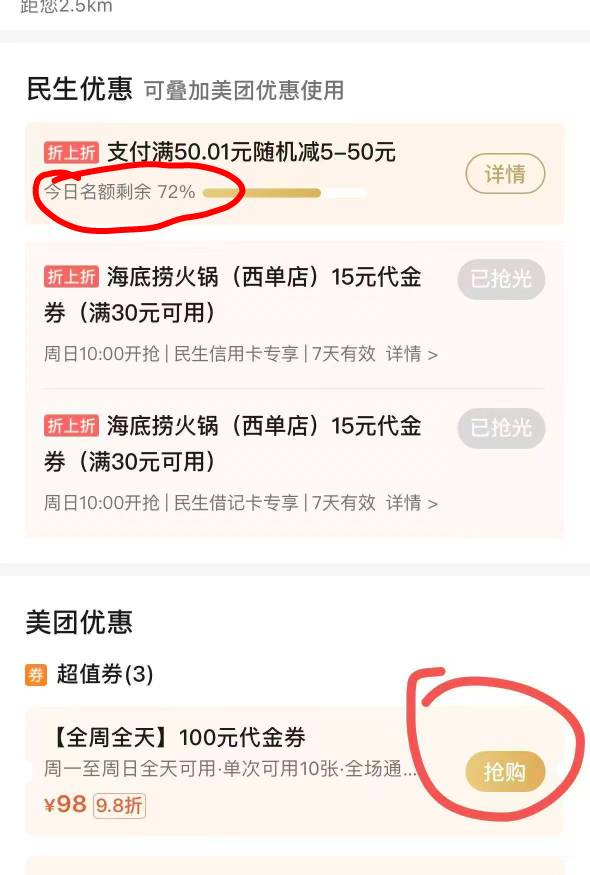 全民生活app 搜索美团到店买海底捞 100 代金卷随机立减,储蓄卡卡 50-60,xyk 限额 50-60,随机立减付款,反回一直付就完事了