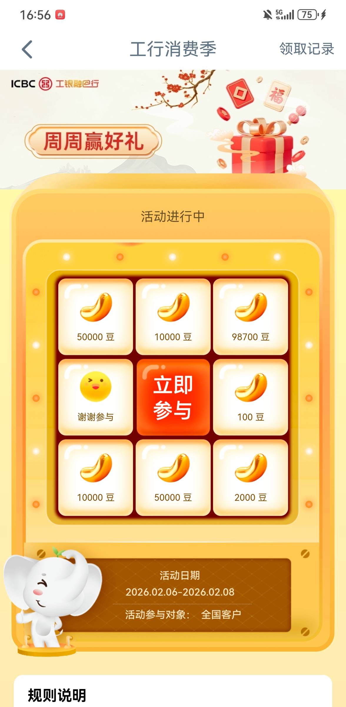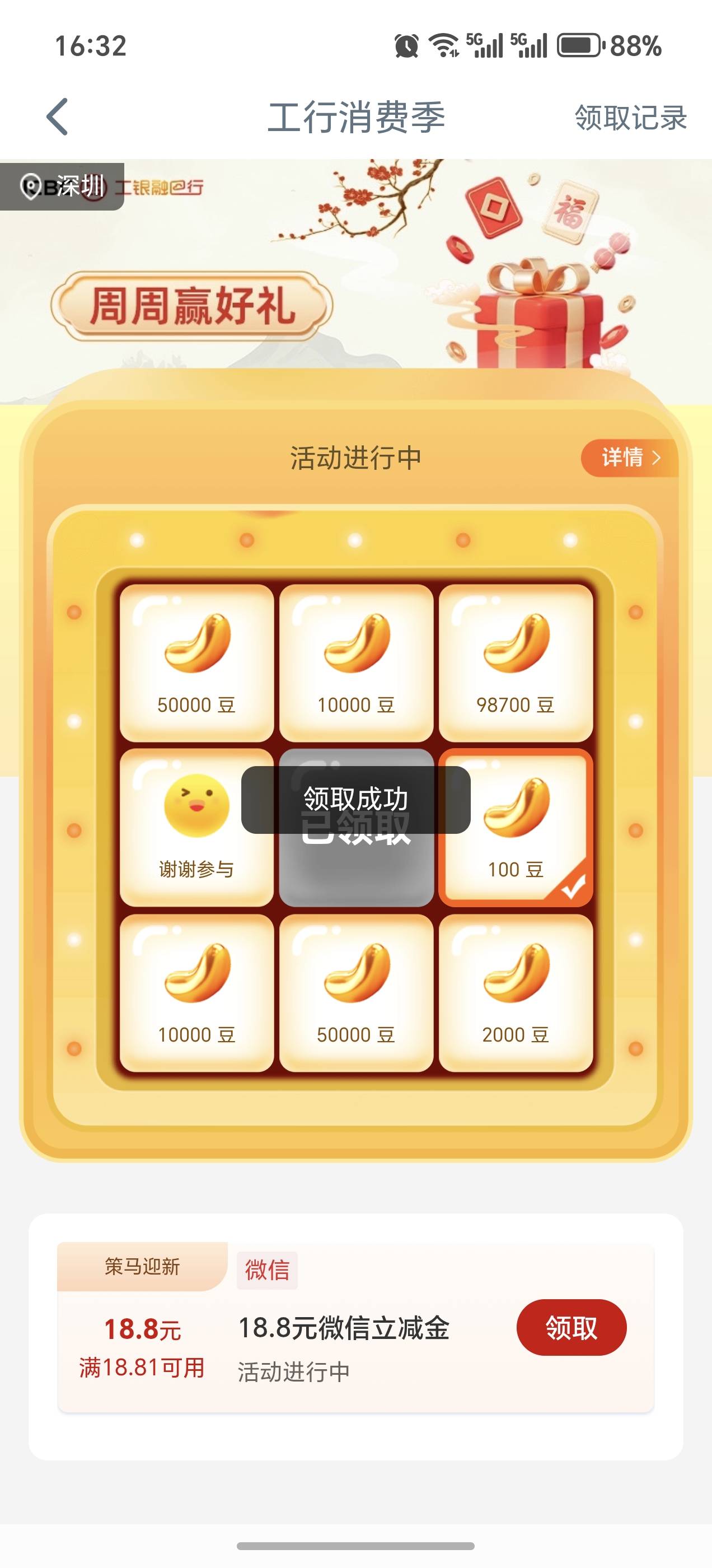 深圳工行,打开消费季有个18.8领取,自测