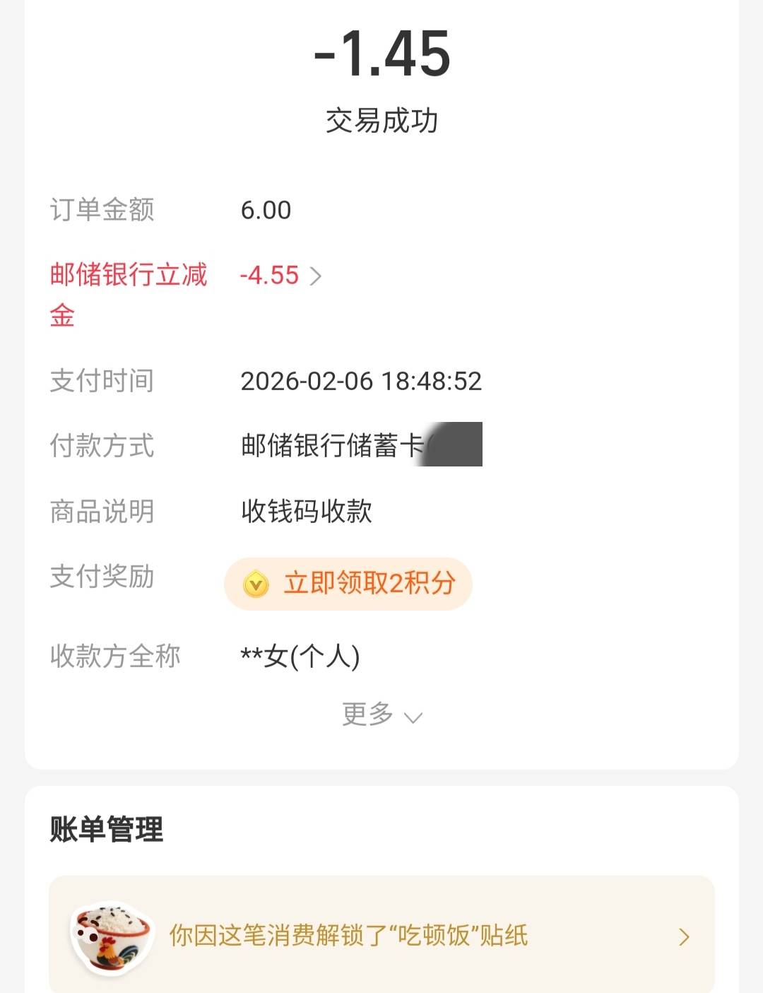 邮政zfb立减,第一笔7-2,第二笔6-4,还可以,广东的卡