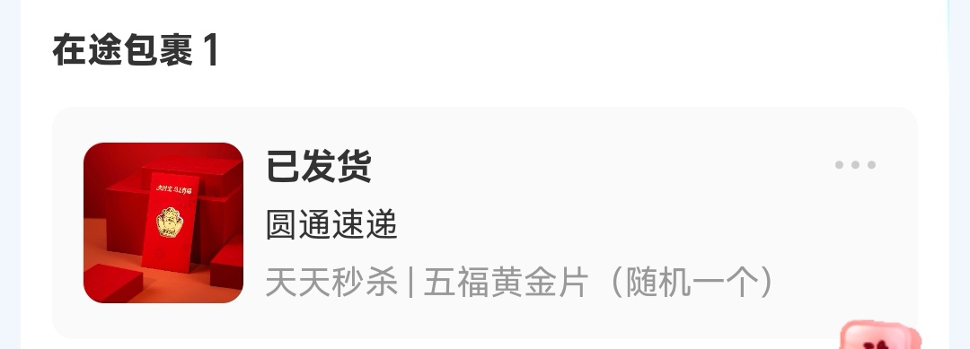 支付宝集卡里面有一个天天有福页面抽黄金,如画圈圈图入口,我昨天晚上抽中一个今天发货了,刚刚去又抽中了一个。