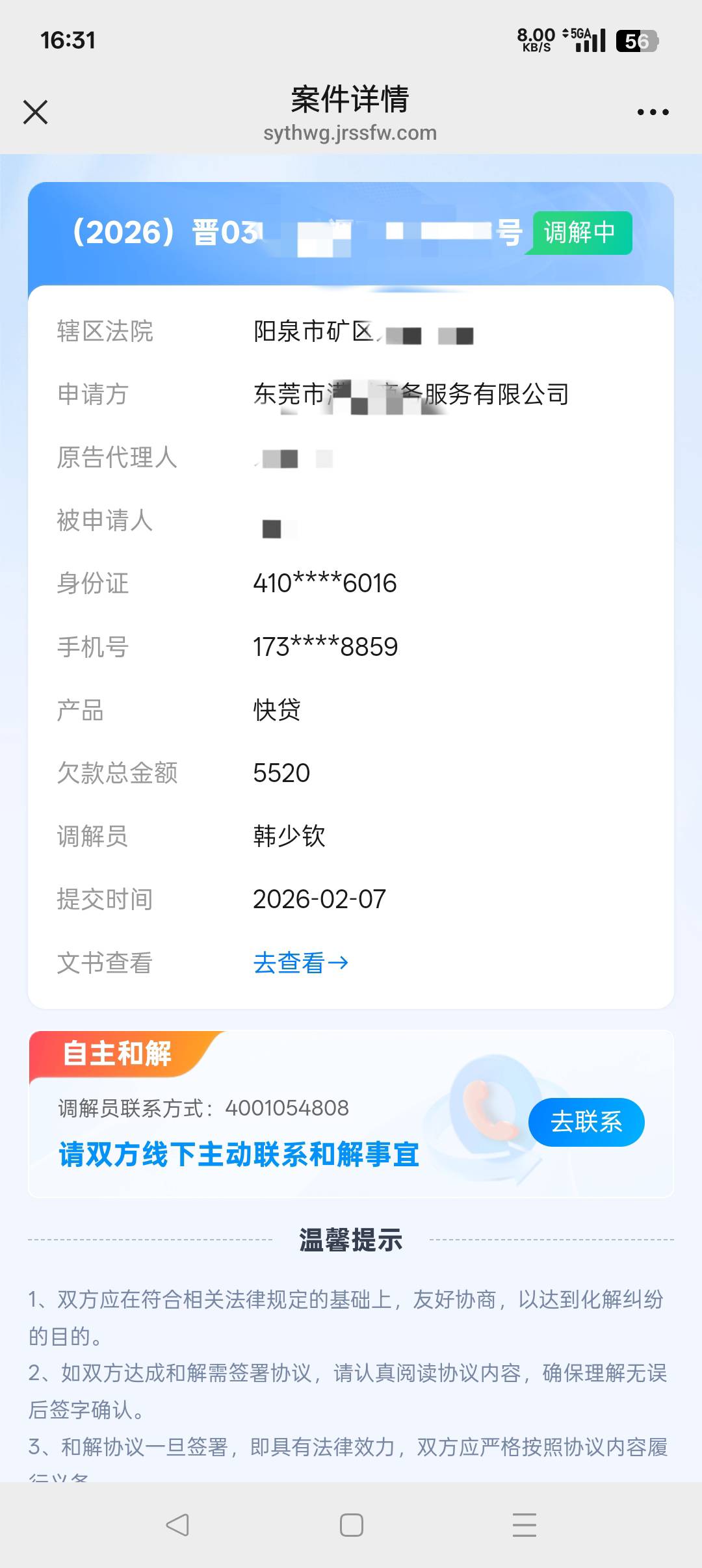 阳泉市矿区法院有我调解信息,但是没有文书