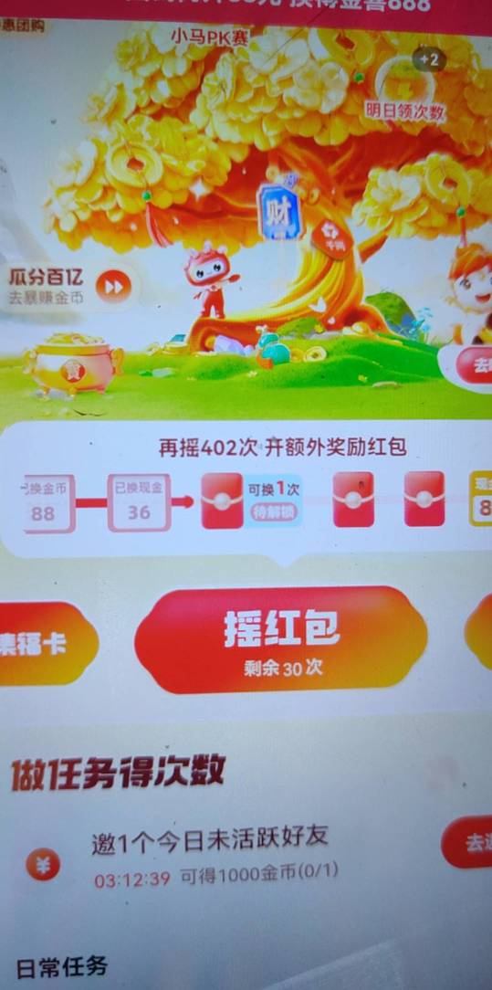 你还没我多!我432次、不过我把团购那个任务做了,花了1.8买了个团购,最后8次的时候来个9999金币,心都凉了、还有3~4次的时候又来个好几千金币,到了红包换第一次换到3块多,又换了一次10几块,点了88