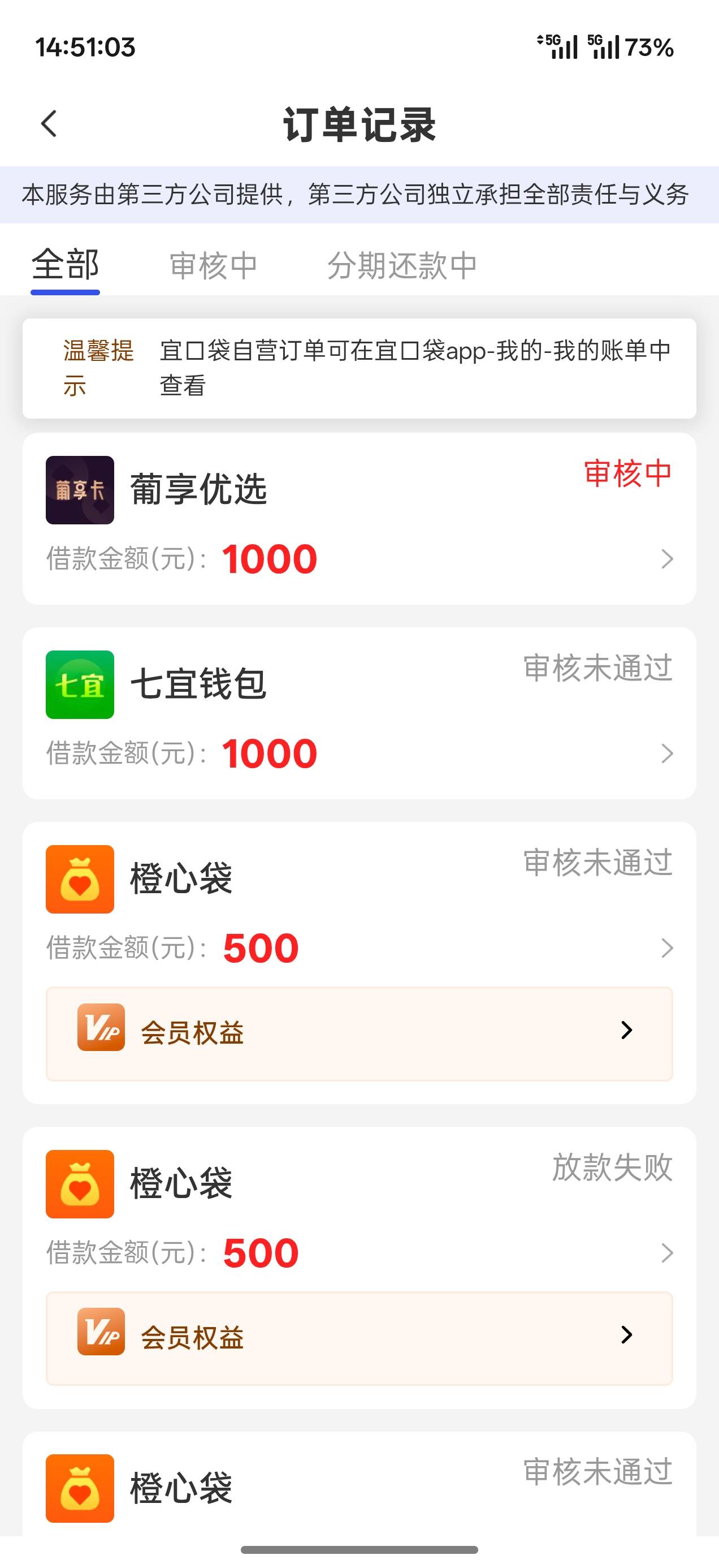 橙心袋第5笔审核两天失败了,现在出来这两个开了会员也失败,现在借不到了,废了